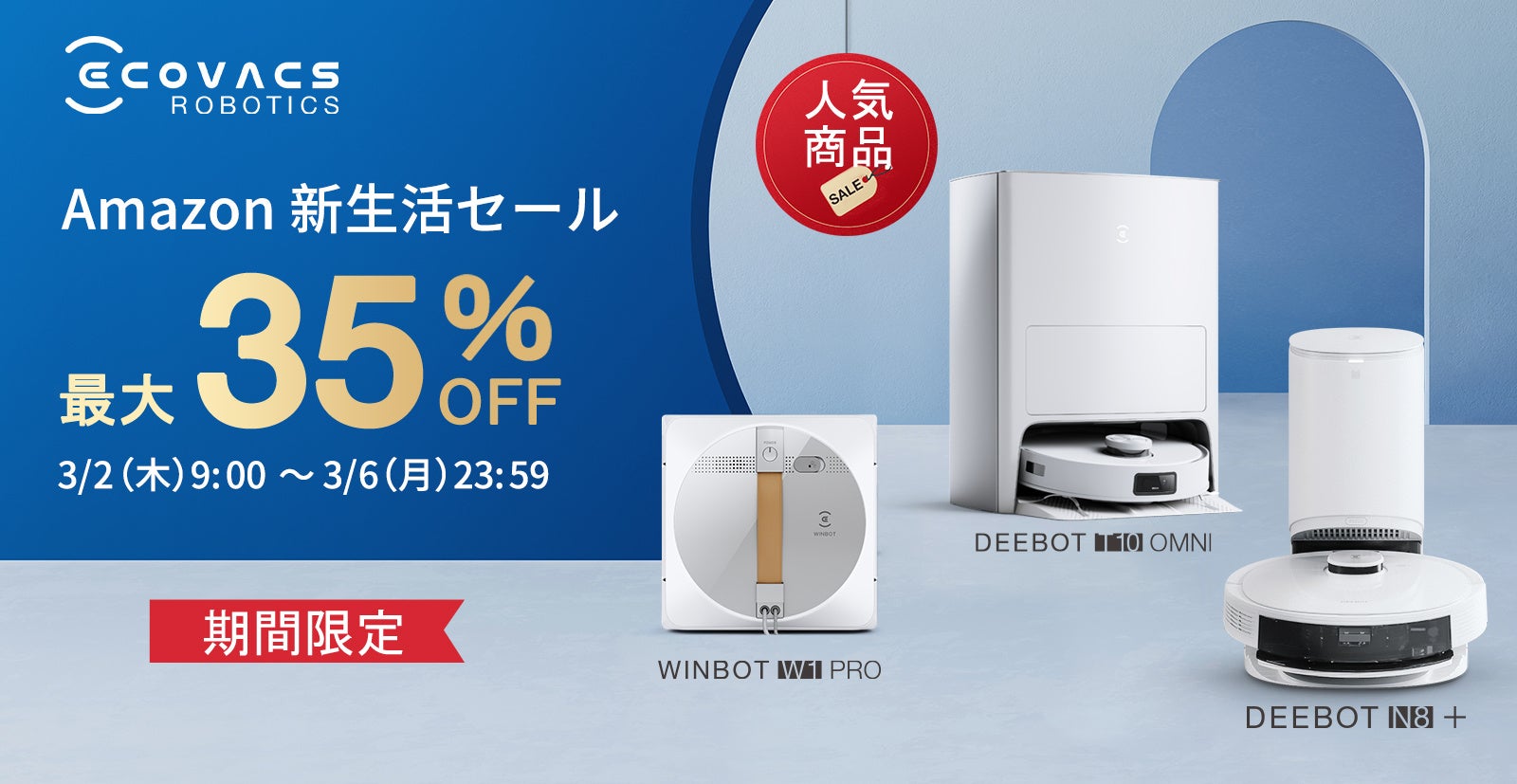 対象は新発売の窓掃除ロボット『WINBOT W1 PRO』 、全自動クリーニングステーション搭載の床掃除ロボット『DEEBOT T10 OMNI』 や、自動ゴミ収集機能付きの『DEEBOT N8+』 など、高性能からコスパ抜群モデルまでアマゾンで人気の商品をラインナップ。さらにセール価格と併用可能な特別クーポンもご用意しました。お得な価格でお買い求めいただけるチャンスを是非お見逃しなく、気持ちのいい新生活を迎えましょう。