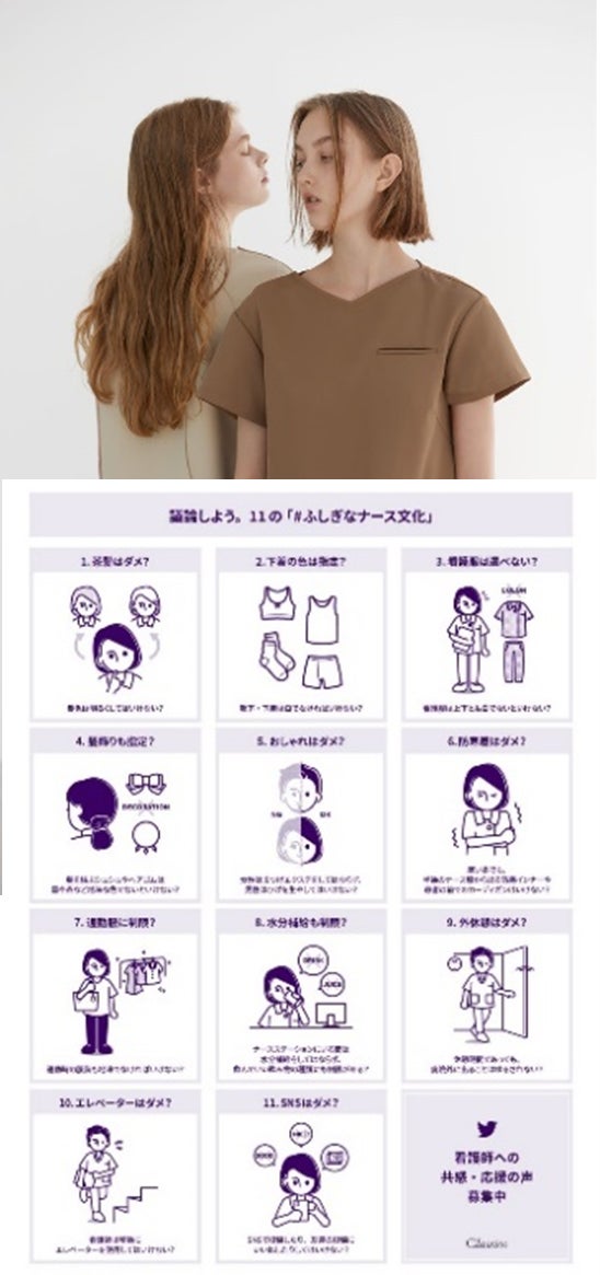 さらに2022年9月には、看護師・病院利用者・病院幹部を対象に、看護師に対する病院ごとに存在する独特なルールや慣習(=「ふしぎなナース文化」)の存在を顕在化する「ふしぎなナース文化に関する調査」を実施。看護師がより生き生きと働ける環境づくりを呼び掛けることを狙いとし、結果を公開するとTwitterで3500件超拡散されるほどSNS・ネット上でルールの必要有無の議論が巻き起こりました。その後「#看護服からはじめよう」プロジェクトの始動を発表し、賛同病院を募り、看護服刷新によるモチベーション向上に関する実証実験を進めています。