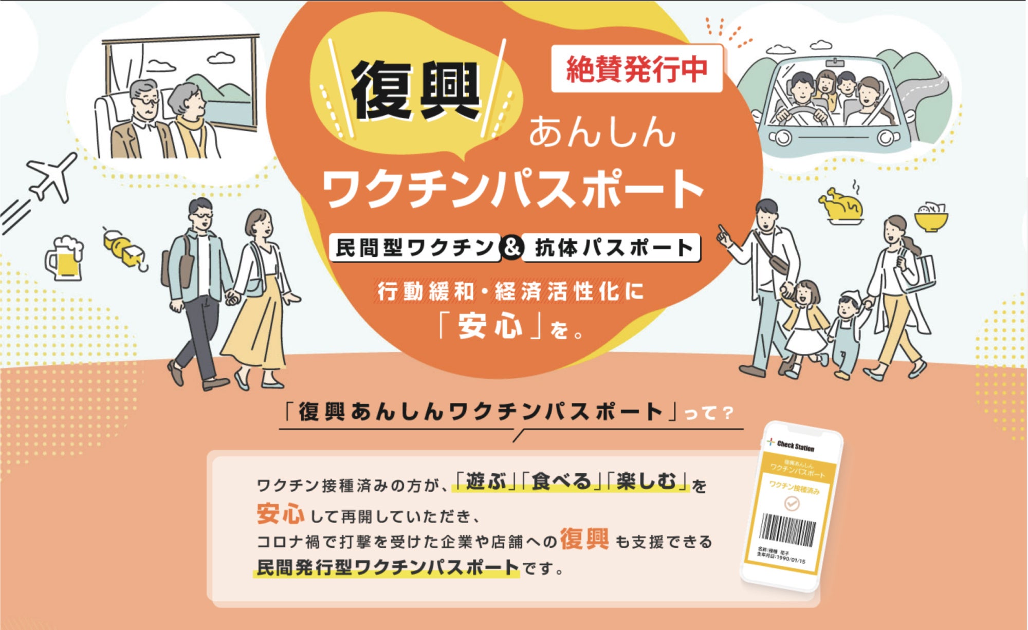 さらに今回の3回目の職域接種会場において、弊社の新型コロナ検査サービス「Check Station」で展開している①中和抗体検査(3,000円相当)を全員に無償提供し、②復興あんしんパスポート(あんパス)を希望者に無料発行いたします。