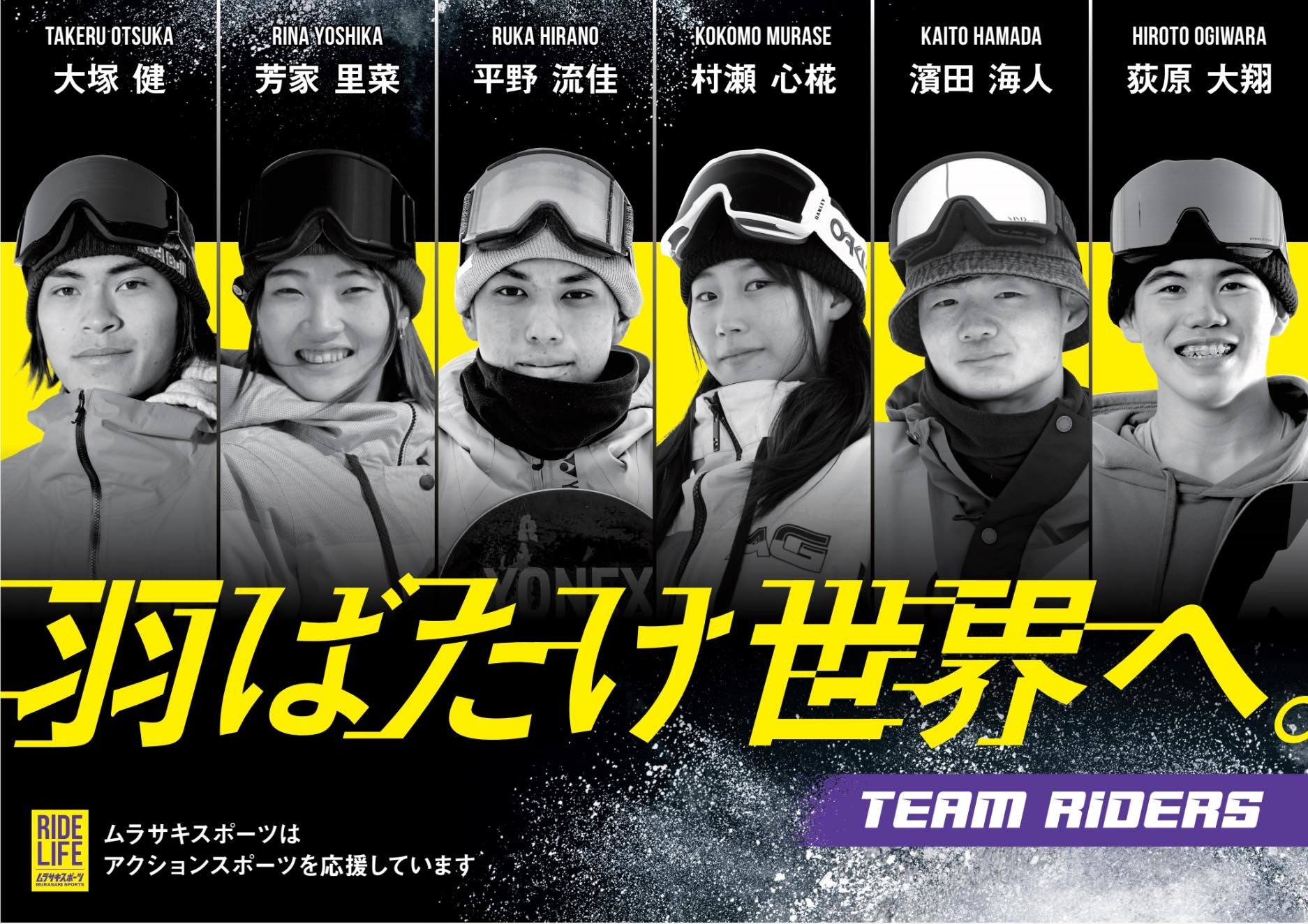予ねてよりアクションスポーツの普及・啓蒙に努めてきたムラサキスポーツは、世界トップレベルのスノーボーダーたちの世界での活躍を誇ると同時に、彼らの未来も全力でサポートしていきます。また、このようなサポートを通じて、スノーボードをはじめとするアクションスポーツの魅力や楽しさをより多くの方に知っていただき、アクションスポーツのさらなる発展に貢献してまいります。