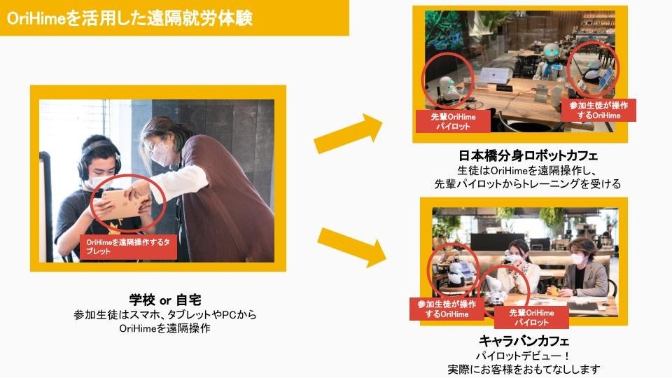 遠隔で行われる全6回の研修は、東京・日本橋の分身ロボットカフェで働いている「先輩パイロット」と、今回初めて遠隔就労体験にチャレンジする特別支援学校の生徒がチームになって研修を積み、地元で開催される「期間限定地域キャラバンカフェ」でのデビューを目指します。