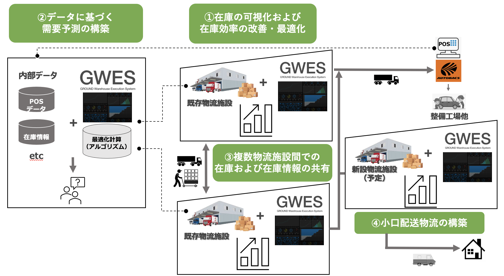 本業務提携では、GROUNDの『GWES』と専門的なノウハウや知見をオートバックスセブンへ提供することにより、先端技術を活用した新たな「物流」基盤の構築に共に取り組むことを目的とします。