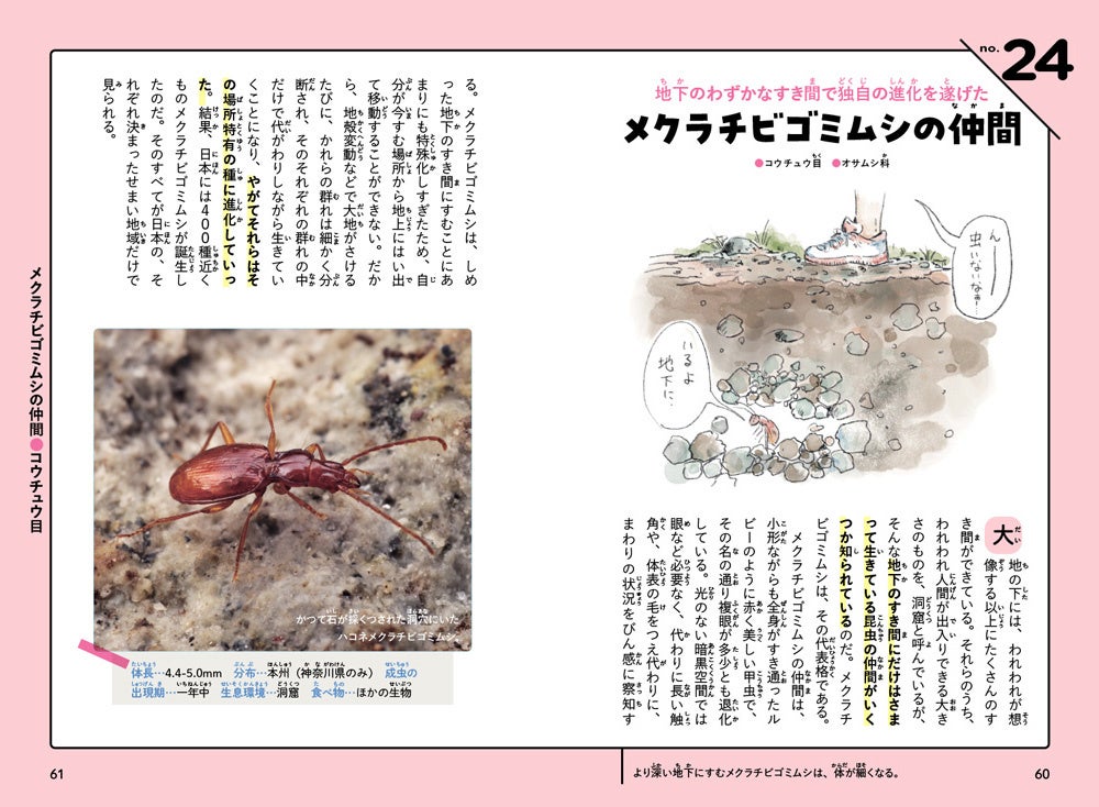 本書は、稀代の昆虫学者である小松貴氏が他の図鑑には載っていない虫を含む63種を厳選し、虫たちが進化の過程で手に入れた面白い生態や独特な姿・形について、数十年にわたる自身の発見と貴重な生態写真とともに解説しています。さらに、人気漫画家じゅえき太郎氏の描き下ろしイラストをふんだんに使用し、虫の生きざまをわかりやすく、楽しく学ぶことができる一冊です。
