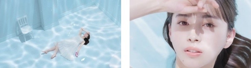 床に投影された水面の光やみずみずしさをいかにリアルに見せるかにこだわった今回の撮影。井桁さんの体の上下に2つの水槽を配置し、その中の水をランダムに動かすことで水面の光の揺らぎを演出しました。寝転んでいる寄りのカットでは、水槽の上にあおむけになって、視線の先にまた水槽がつるしてあるという、何ともドキドキするような状況のセットだったにもかかわらず、一切動じることなく、終始集中して撮影に臨んでいた井桁さん。また、横になっているシーンでは表情に加えて、上下にある水槽の水の動き、カメラワークが完璧に整う状態を狙ってテイクを重ね、全てが完璧にそろった場面では、現場から大きな歓声が上がりました。
