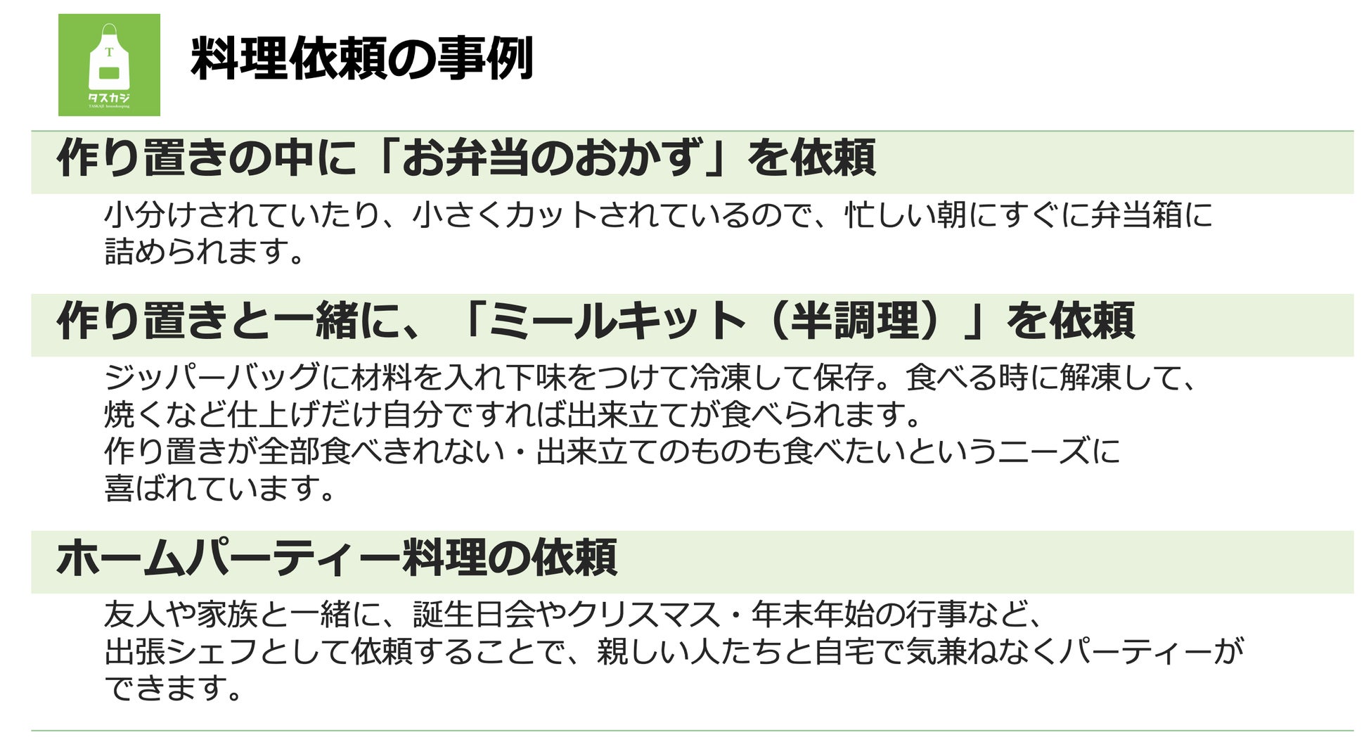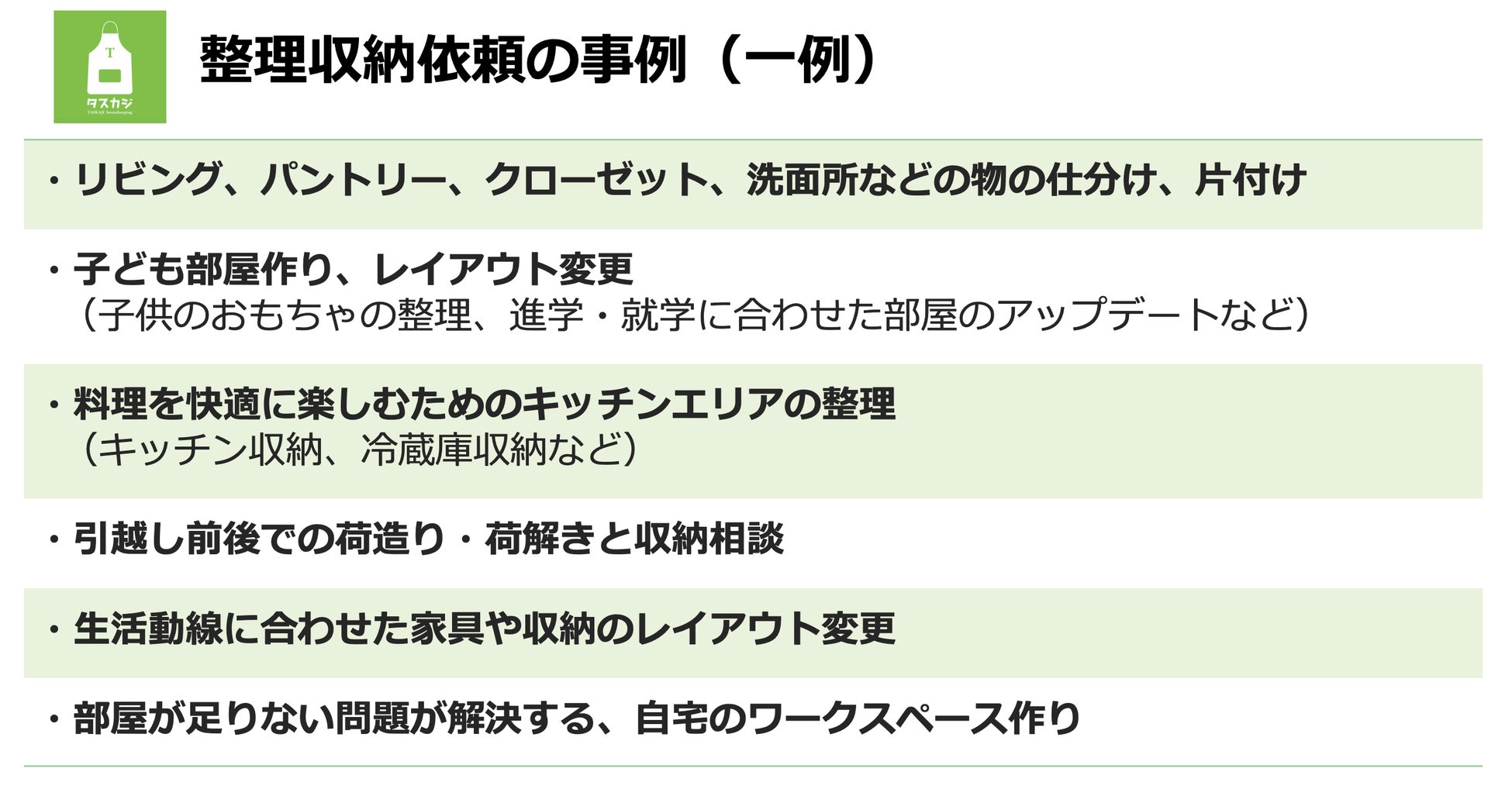 家事代行分野での「数日分の作り置き」「整理収納」がメジャーな業務となったのは、それまで掃除がメインだった家事代行業界において、タスカジはパイオニア的存在といえます。