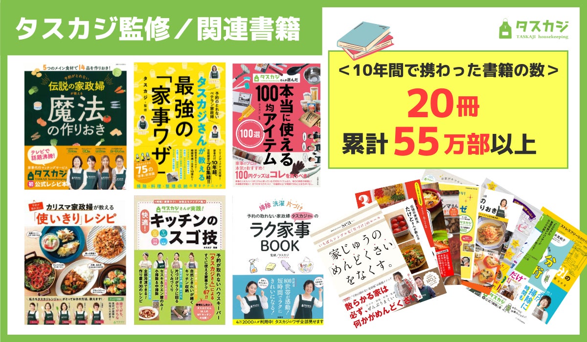 タスカジが監修/関連した書籍は、この10年で20冊に携わりました。累計55万部以上発行されています。「家事は単純作業」と思われがちな家事のノウハウを書籍化し、家事は誰でもできることではなくクリエイティブな仕事であること、またハウスキーパーという仕事の価値観向上を目的として取り組んでいます。
