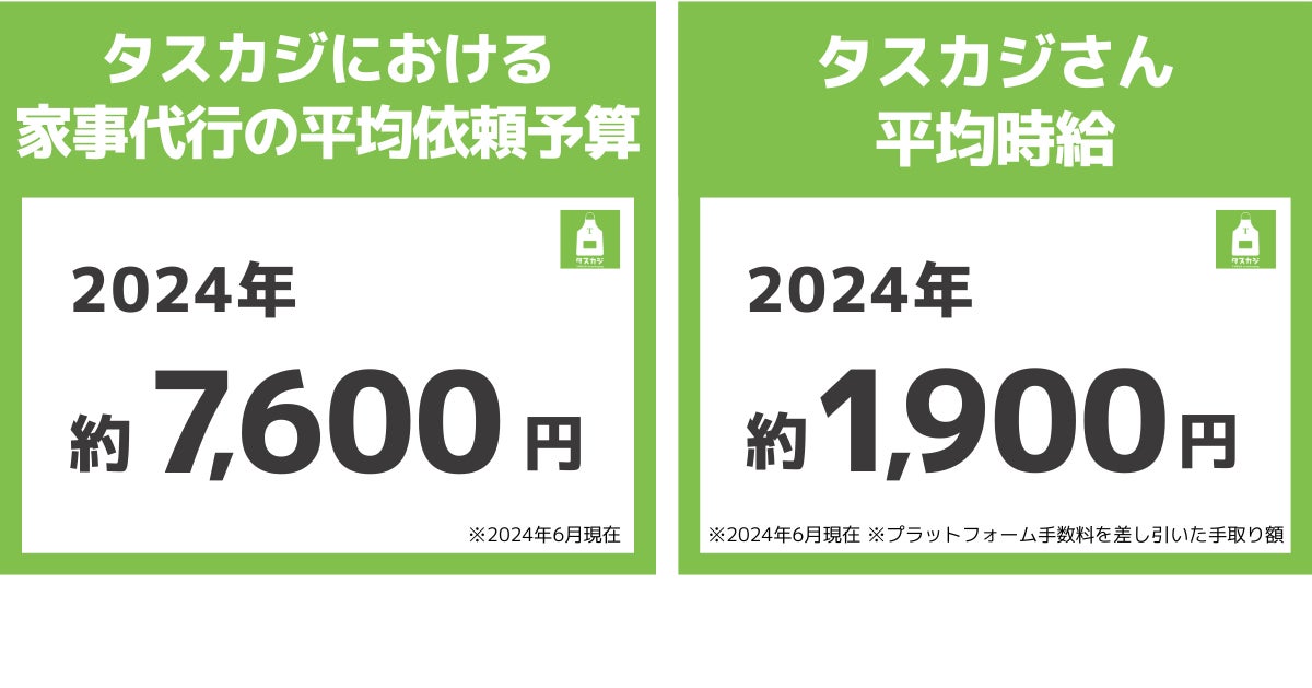 タスカジの料金は、プランA〜プランKの11プランあり、1時間あたり1,500円〜4,510円(*1)、2024年6月時点での1回あたりの依頼の平均予算は7,600円になっています(1時間あたり約2,533円)。家事代行の料金相場は1時間あたり3000円〜6000円程度となっており、タスカジは業界の中でも最安値水準で家事代行をご利用いただけます。また、タスカジさんの平均時給は現在約1,900円となっています。ハウスキーパーの平均時給がおよそ1150円〜1300円程度(関東のみ、*2)とされる中、タスカジさんの時給は1時間当たり1,230円〜3,000円で、業界でも最高時給の水準です。