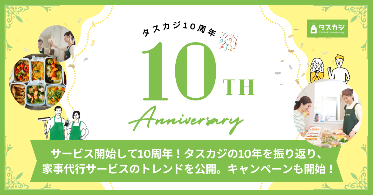 シェアリングエコノミーの家事代行マッチングプラットフォーム「タスカジ」を運営する、株式会社タスカジ(本社:東京都港区、代表取締役:和田幸子、以下タスカジ)は、2014年7月にサービスインし、今年で10周年を迎えました。この10年で家事代行に対する認識も大幅に変わりました。タスカジの10年のあゆみを振り返り、まとめました。また、10年のご愛顧に感謝して、初回スポット依頼の割引キャンペーン開催いたします。