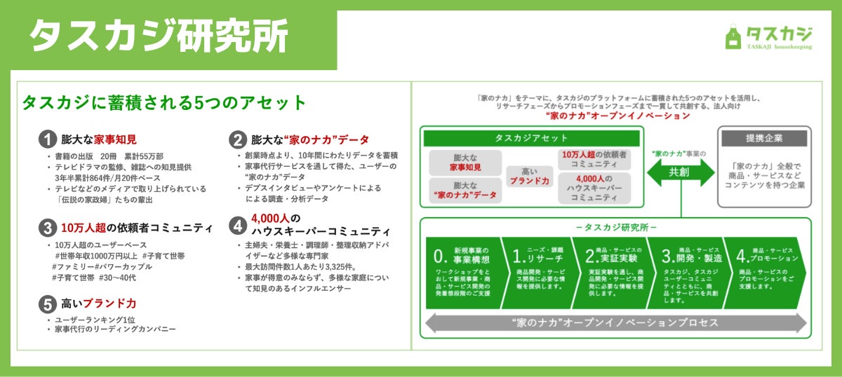 タスカジ研究所は、家事代行マッチングプラットフォーム「タスカジ」創業以来、10年にわたり蓄積された”家のナカ”データと、10万人超のユーザー・4千人のハウスキーパーからなるコミュニティや家事知見を活用し、住宅・家電・食品・消費財・サービス・小売業界など”家のナカ”の課題に取り組む企業様に向け、”家のナカ”オープンイノベーションサービスを提供しています。