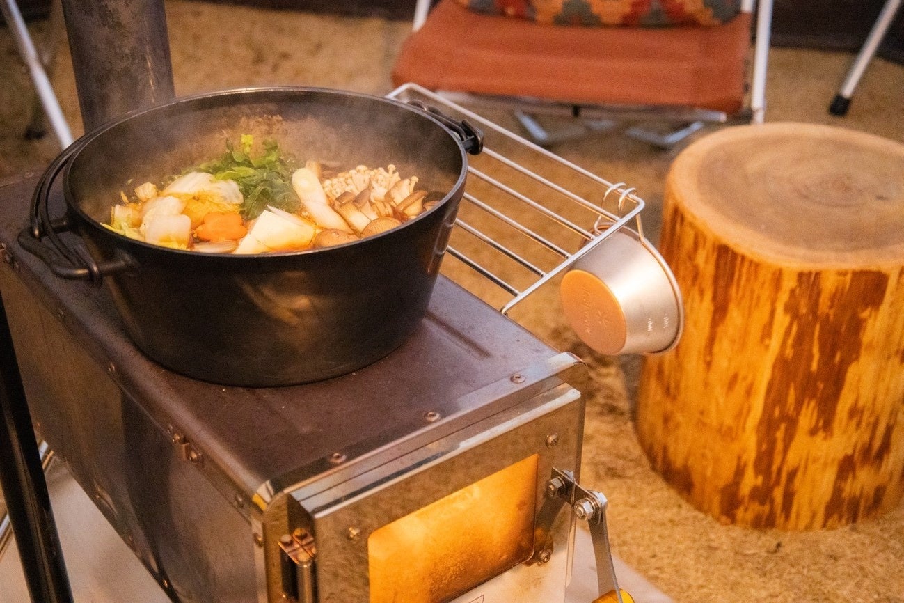 薪ストーブは暖を取るのみならず、ダッチオーブンなどの鍋料理にも対応。大型のグリルで焼くステーキや、THE FARM自慢の焼き野菜のみならず、同時に温かい鍋料理も楽しめるのがこのプランの魅力。夏ではなかなか味わえない、冬だからこそのBBQ+鍋料理をご堪能ください。