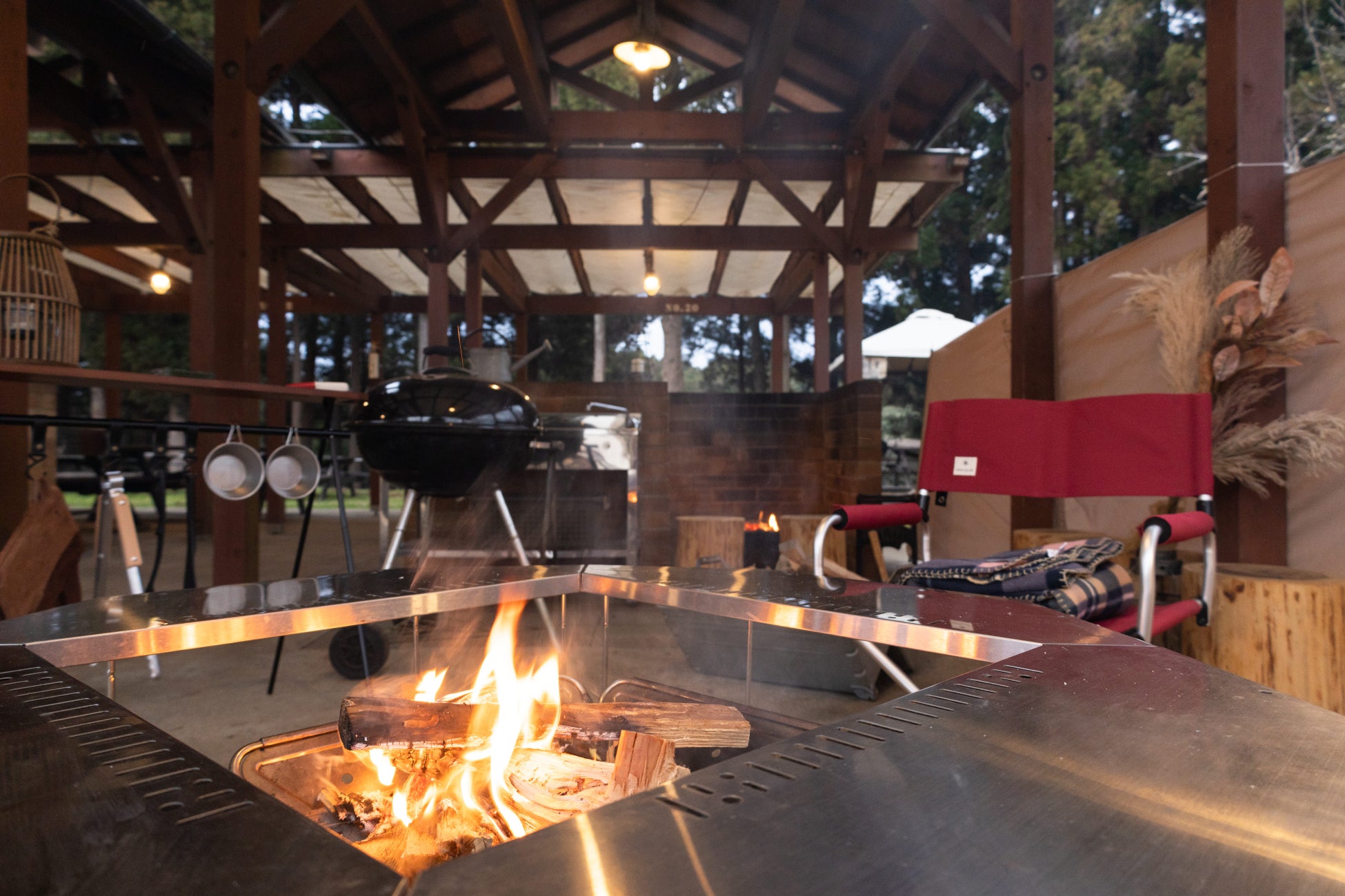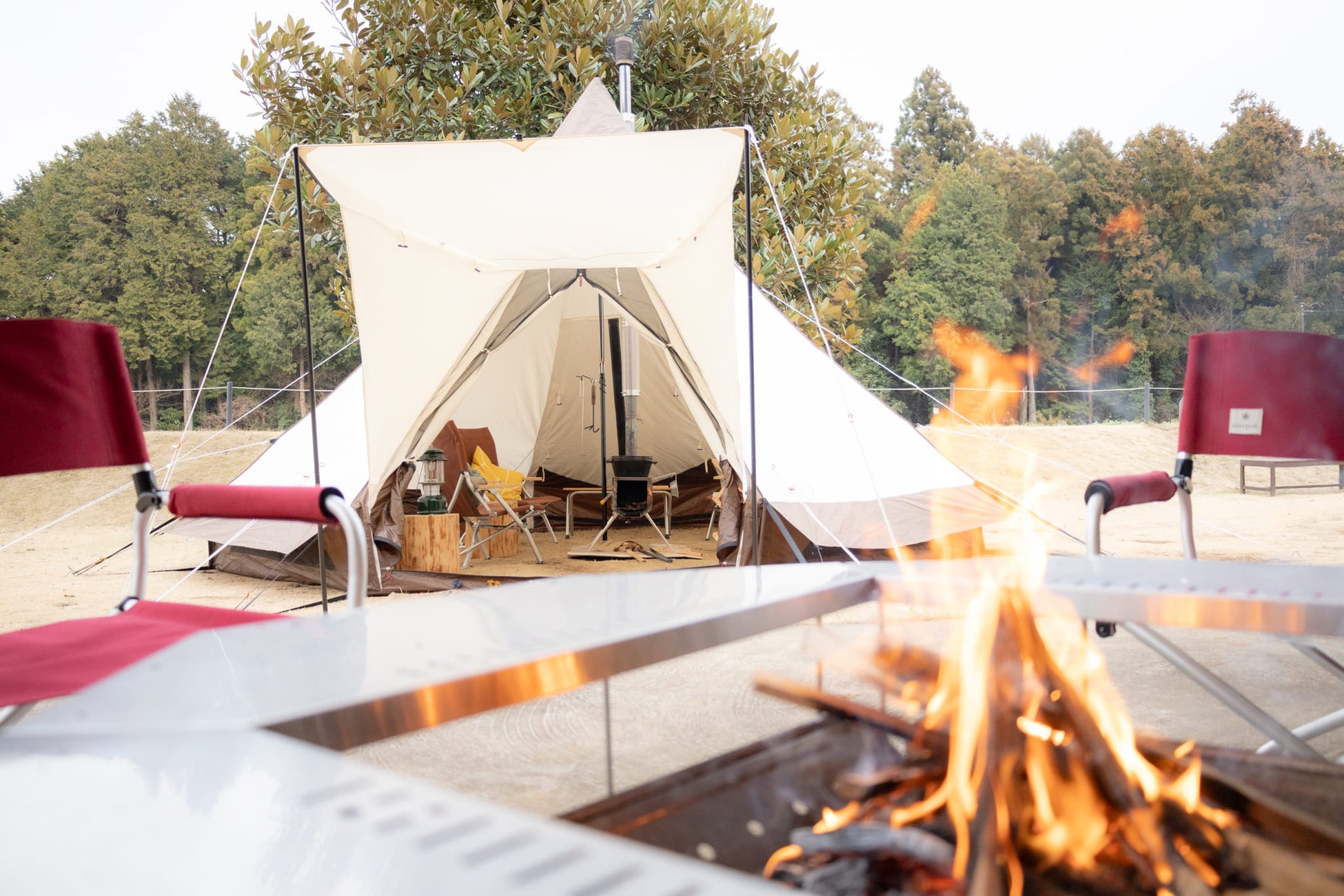●薪ストーブのティピーテントと、陣幕&焚き火台のあるBBQピット併設で寒さ知らず