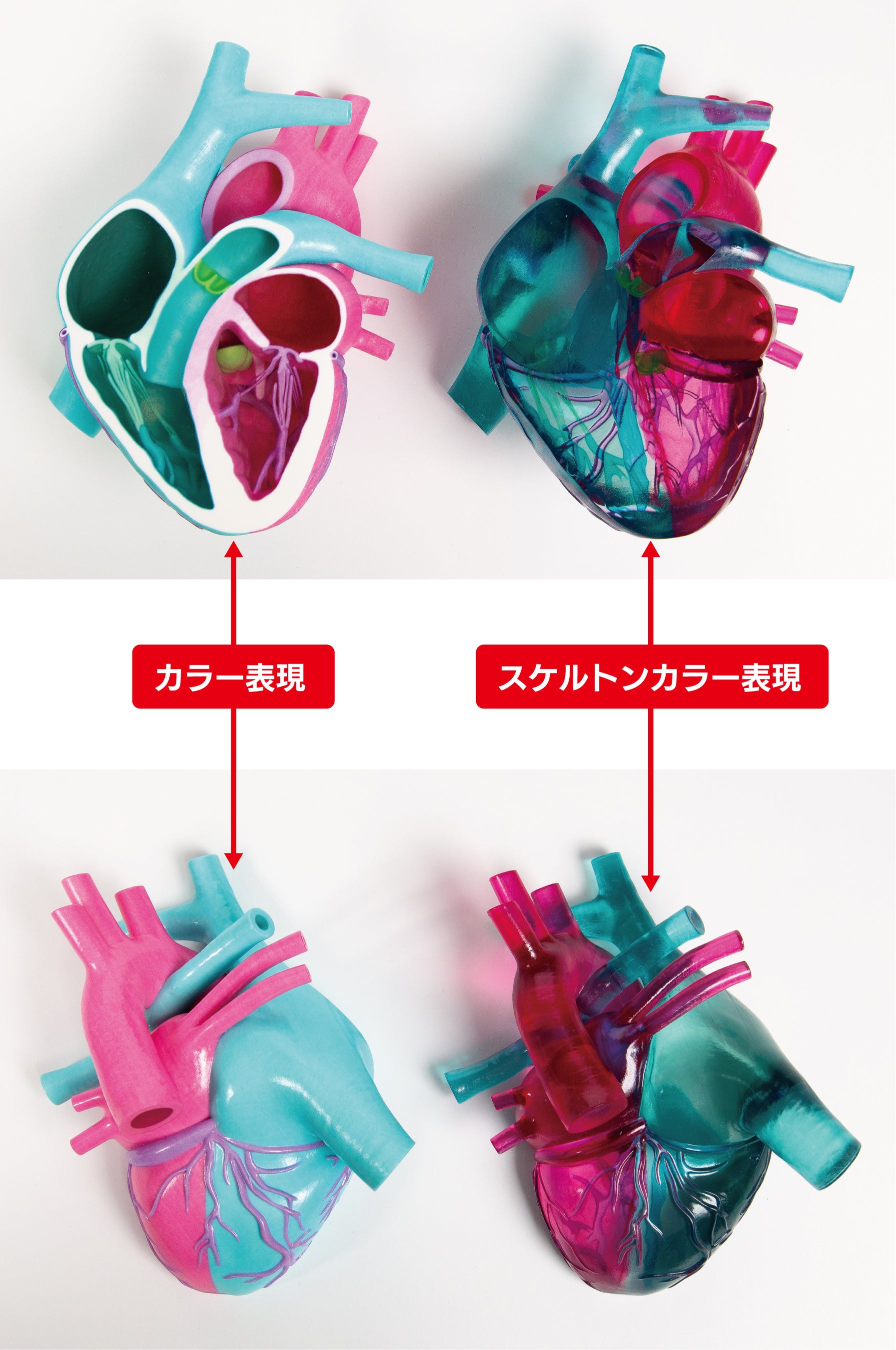 フルカラー3Dプリントでは臓器を色分けした模型の造形も可能です。また、スケルトンカラー(色つきの透明)表現で造形することにより、臓器内部の可視化もでき、医療模型での活用も期待されます。