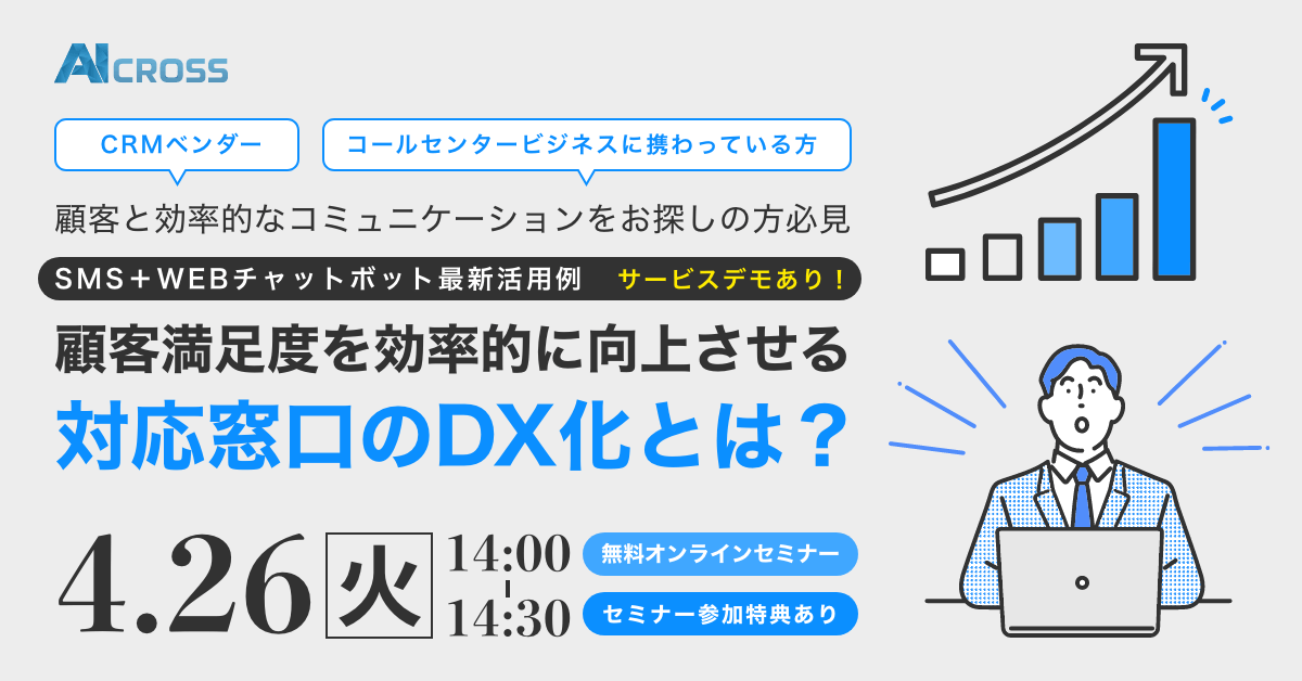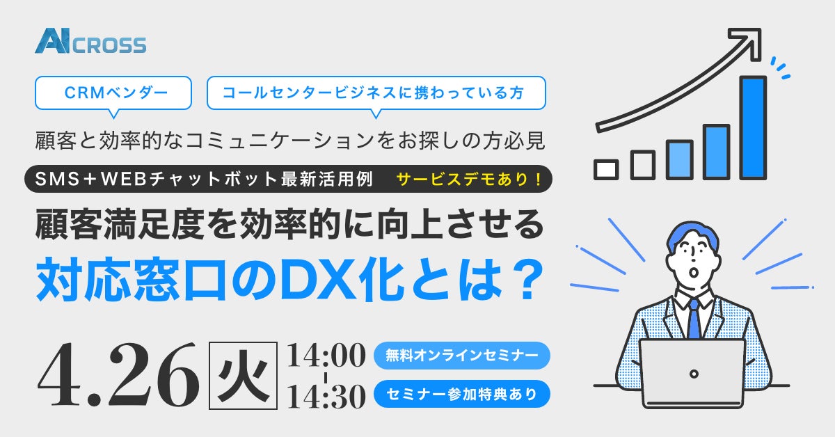 AI CROSS株式会社(本社:東京都港区、代表取締役 原田典子、証券コード:4476)は、2022年4月26日(火)に自社主催のオンラインセミナーを開催します。効率的な顧客対応をテーマに『対応窓口のDX化』を解説いたします。