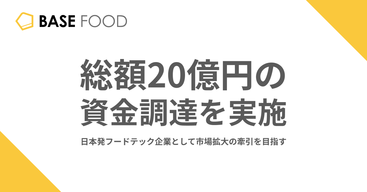 完全栄養食のパイオニアであるベースフード株式会社(代表取締役社長:橋本舜、本社:東京都目黒区、https://basefood.co.jp/、 以下 ベースフード)は、シニフィアン株式会社及びみずほキャピタル株式会社が共同で運営するグロース・キャピタル「THE FUND」を引受人とする第三者割当増資により、10億円の資金調達を実施しました。同時に、株式会社三菱UFJ銀行、株式会社商工組合中央金庫、株式会社りそな銀行、株式会社三井住友銀行と総額10億円の融資契約を締結し、第三者割当増資と融資を合わせて総額20億円の資金調達を実施したことをお知らせします。