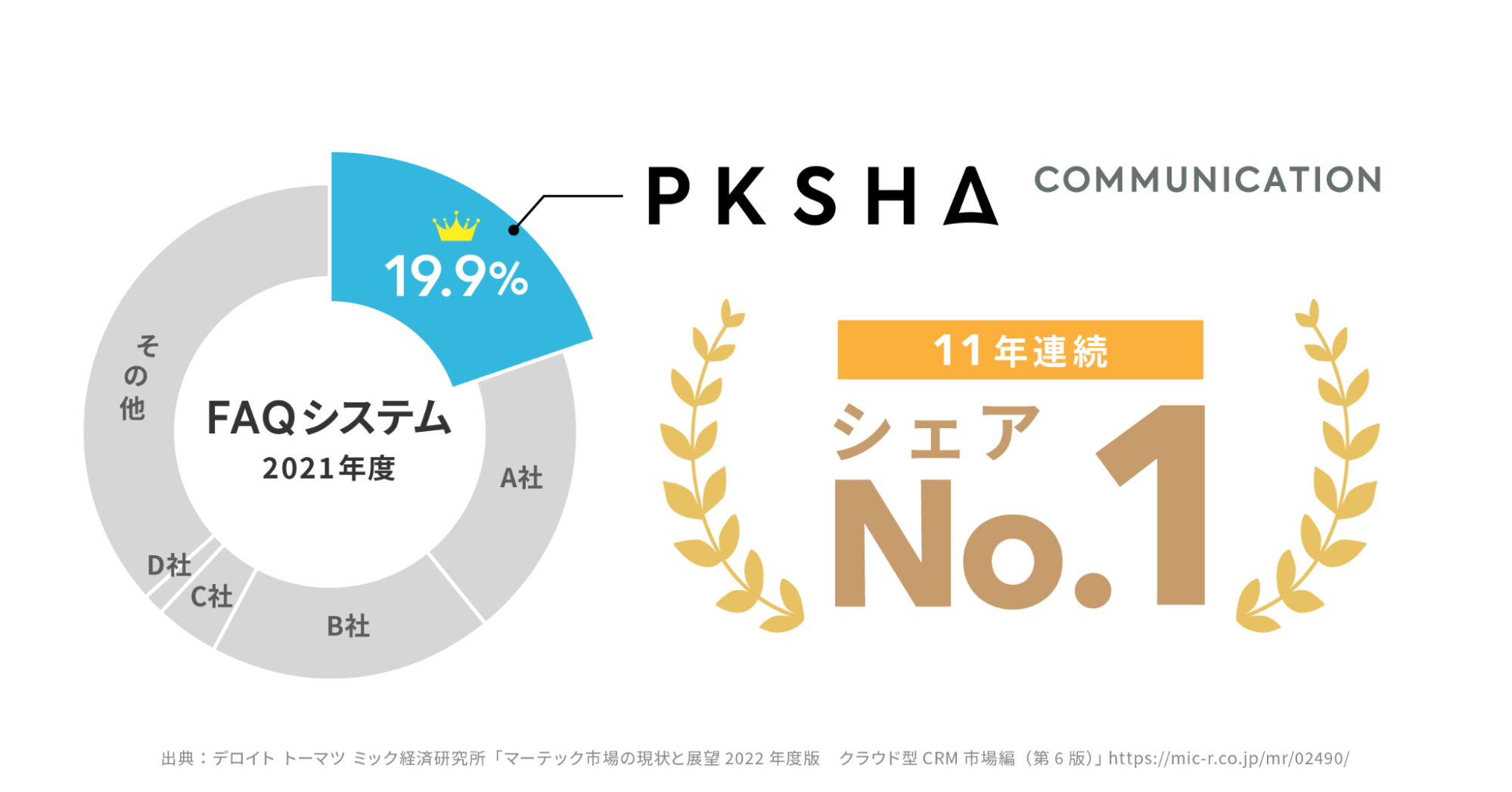 株式会社PKSHA Technology(本社:東京都文京区、代表取締役:上野山 勝也、以下PKSHA)は、グループ会社である株式会社PKSHA Communication(本社:東京都渋谷区、代表取締役:佐藤 哲也)が展開する、PKSHA FAQ(※)が、デロイト トーマツ ミック経済研究所の「マーテック市場の現状と展望2022年度版 クラウド型CRM市場編(第6版)」(※2)で市場シェア1位を獲得したことをお知らせします。PKSHAは「人とソフトウエアの共進化」というビジョンの元、今後も、FAQシステムやチャットボットをはじめとするAI SaaS及びAIソリューションの総合的な展開を通じ、カスタマーサクセス領域とエンプロイーサクセス領域における提供価値の拡大を図ります。