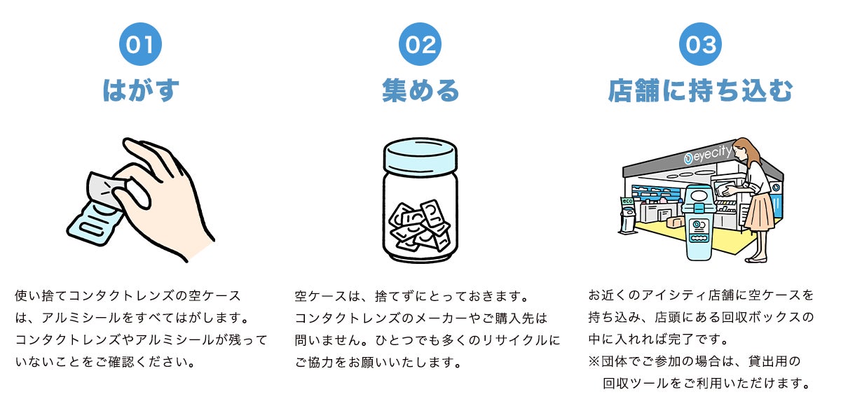 「アイシティ ecoプロジェクト」は、リサイクルが可能な使い捨てコンタクトレンズの空ケースを対象に、全国のアイシティ店舗に専用ボックスを設置して回収するリサイクル活動です。3つの社会貢献(1.空ケースの再資源化による環境保全、2.障がい者の自立・就労支援、3.日本アイバンク協会への寄付)へとつないでいくことを目的として、2010年より業界で初めてこの活動をスタートし、今年で活動期間は14年目を迎えました。