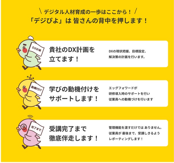 エッグフォワード株式会社(本社:東京都渋谷区、代表取締役社長:徳谷 智史)は、新たなデジタル人材育成サービス「デジぴよ」をリリースいたします。