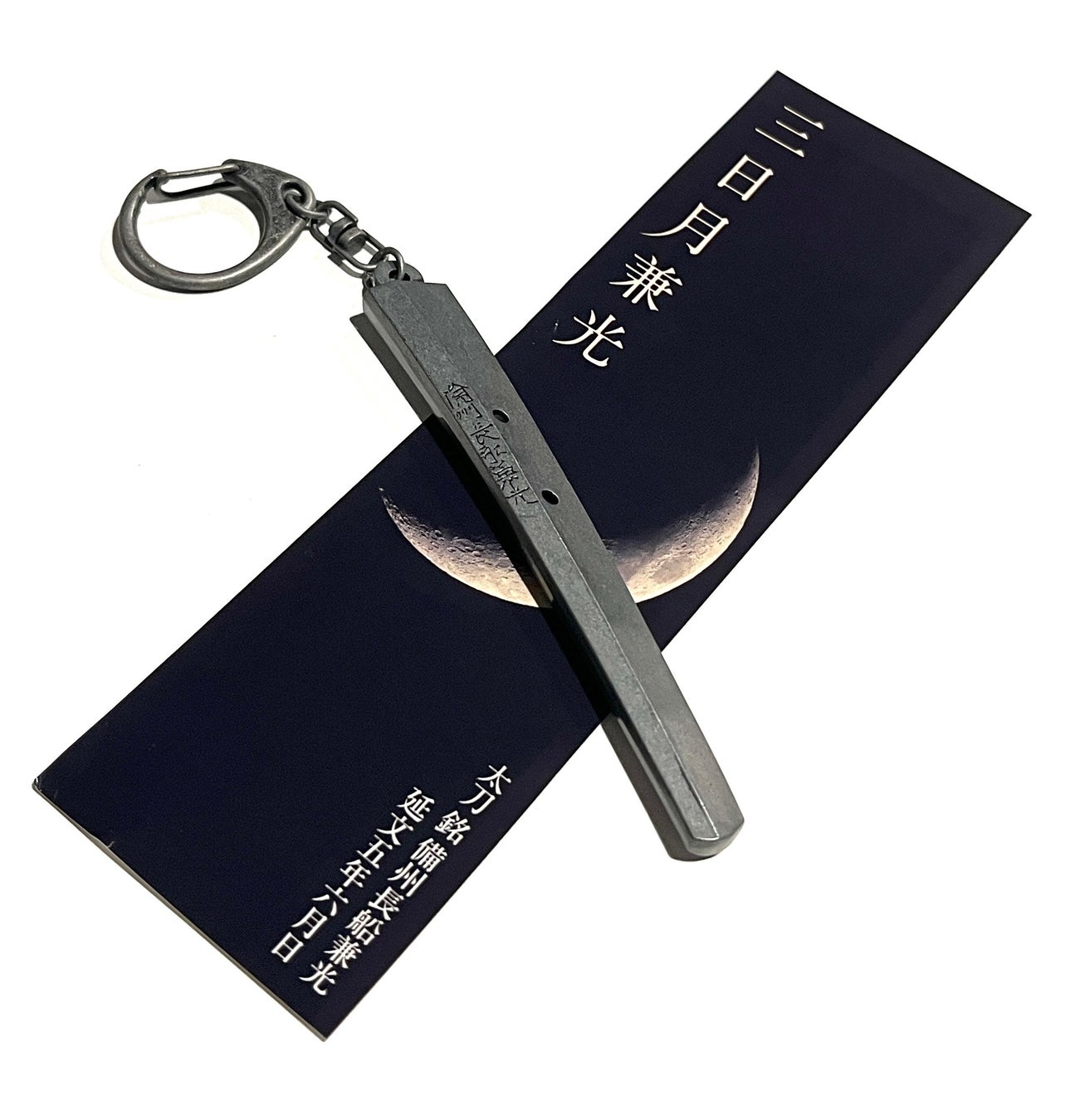 三日月兼光の茎をミニサイズで忠実に再現したキーホルダー。茎の形状や目釘穴、裏側の年紀に至るまで本物そっくりにこだわって制作しました。小さいながらも銘までしっかり刻印。金属製のキーホルダーとなっており、本物さながらの茎の質感を感じられる仕上がりです。名刀をさりげなく持ち歩ける、名古屋刀剣博物館ならではのアイテムです。
