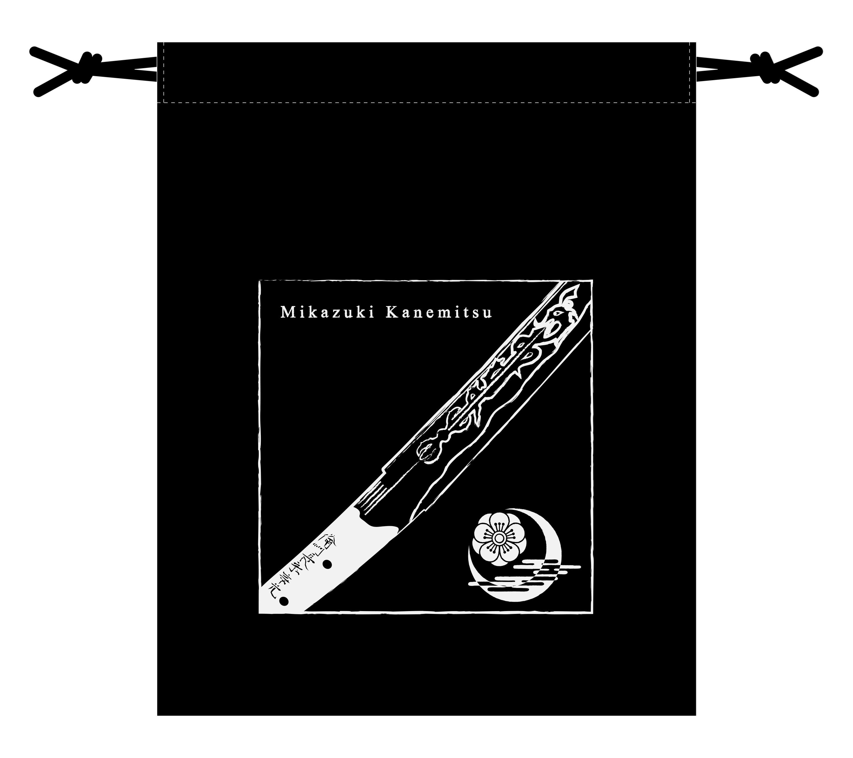 三日月兼光の刀身彫刻「倶利伽羅」をデザインしたコットン巾着。梅・月のモチーフをあわせ、刀の魅力をさりげなく表現しています。コスメやお菓子など、小物入れとして使いやすいサイズで普段使いにもおすすめです。