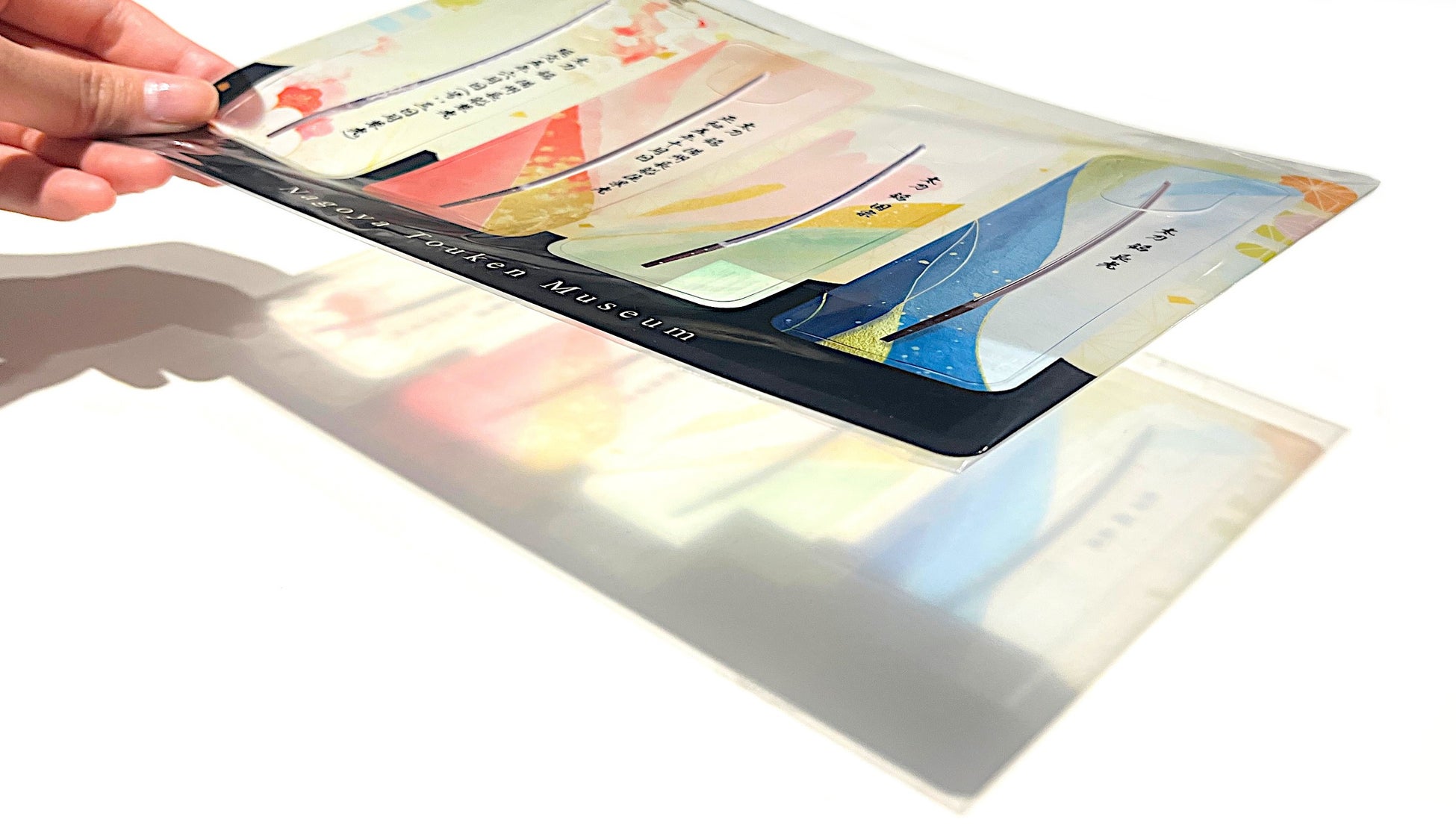 紙を入れると絵柄が変化する、ユニークなA4サイズのクリアファイル。実用性はもちろん、コレクションや本展の記念にもなるアイテムです。