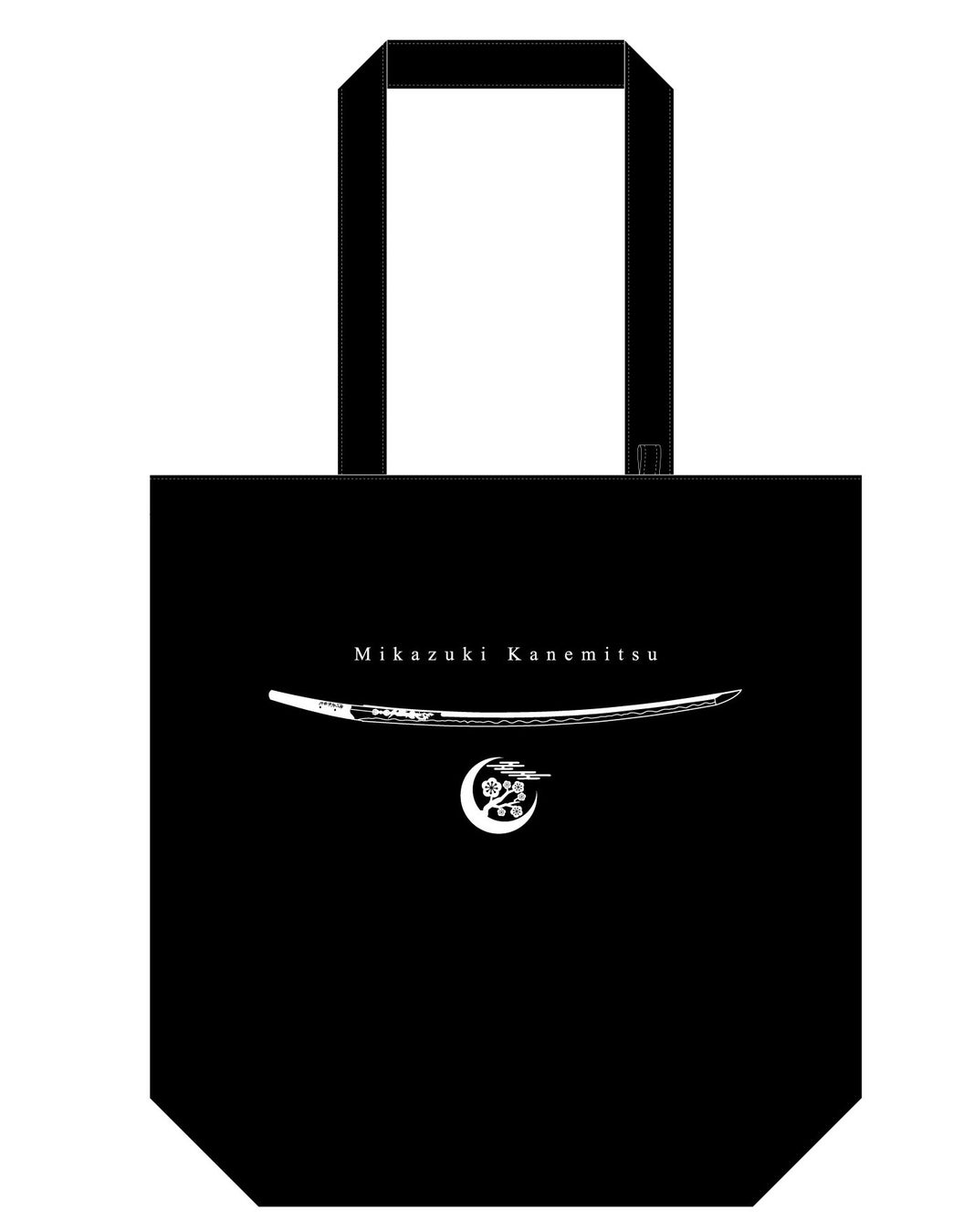 黒地に刀身のシルエットと梅・月のモチーフをあしらったトートバッグ。落ち着いたデザインで普段使いしやすく、刀の世界観も楽しめます。茎アクリルキーホルダーなどを重ねて付けてもおしゃれに決まりそう!本展の記念としてはもちろん、日常でも活躍するアイテムです。