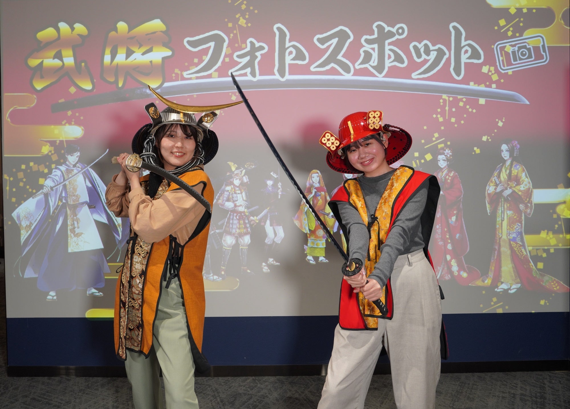 名古屋刀剣博物館の本館2階には、大スクリーンの前で記念撮影ができるフォトスポットがあります。フォトスポットに設置されたパネルを操作して、お好みのシーンで撮影を楽しめるコーナーです。特別展「三日月兼光と備前の名刀」の開催にあわせて、期間限定で特別展デザインの背景が登場します。本展ならではの背景で、来館の思い出の1枚をぜひ撮影してみてください。