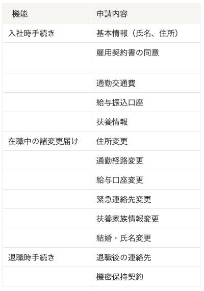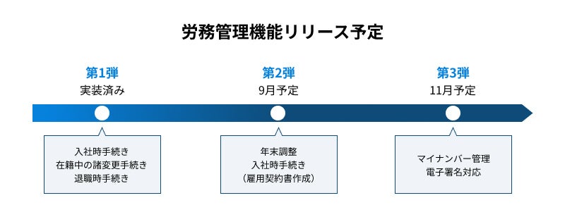 入社手続き、在職中の諸変更届、退職手続きを皮切りに、年末調整やマイナンバー管理、電子署名など、順次展開していきます。