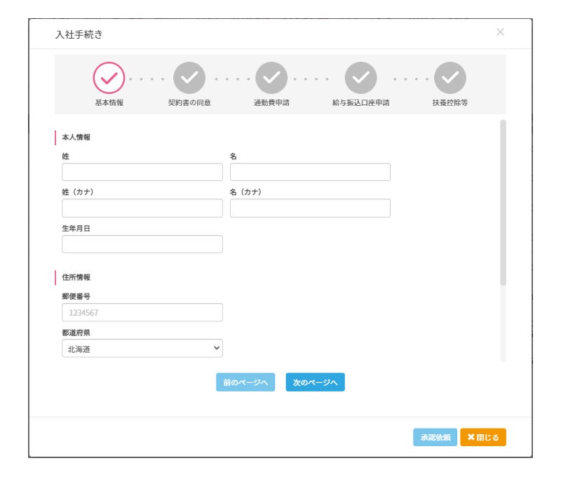 手順に従って必要な項目を入力していきます。分かり易いユーザーインターフェースで迷いなく入力でき、また、必須項目の入力チェックがされるので、抜け漏れもなく入力して頂けます。