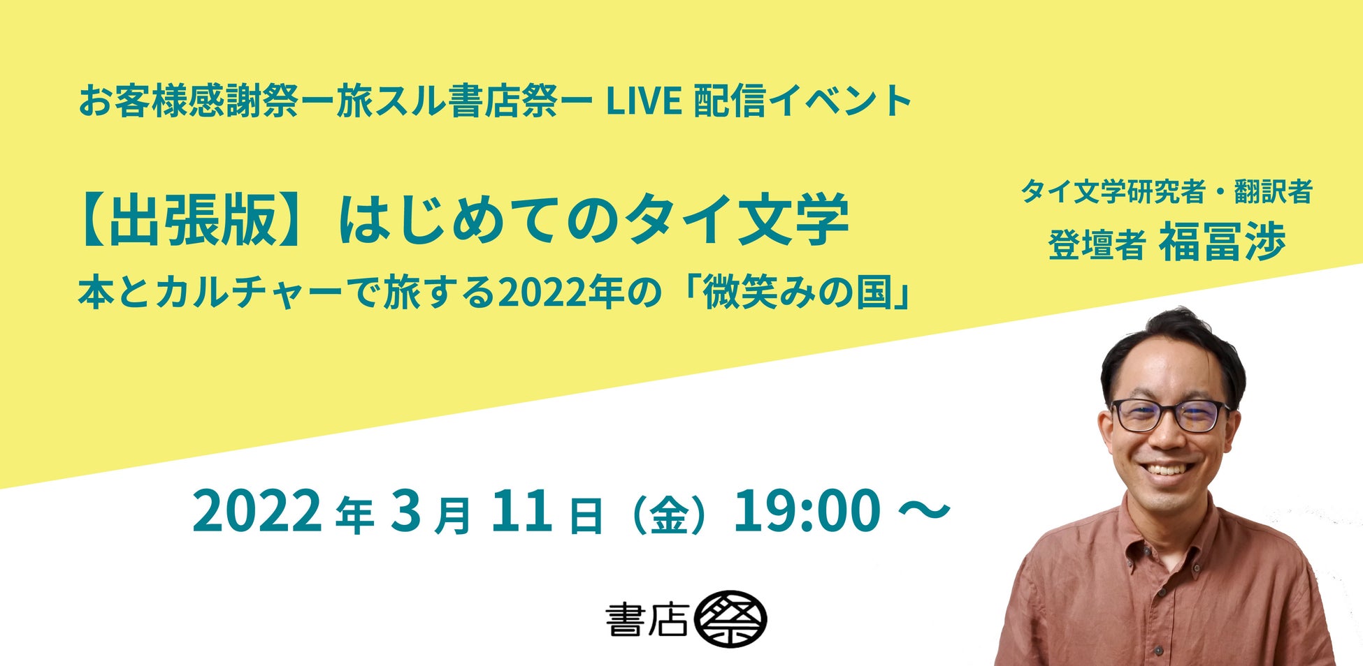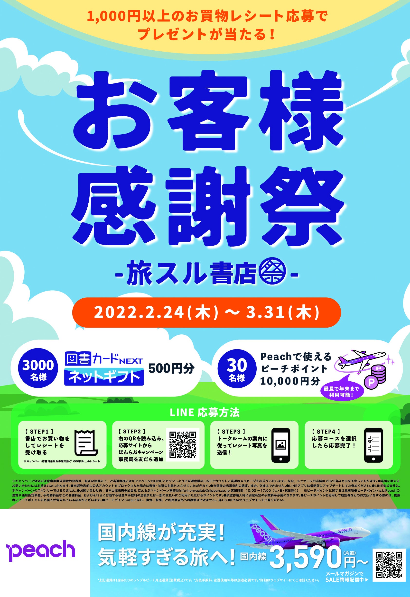 日本出版販売株式会社(代表取締役社長:奥村 景二、略称:日販)は、タイ国政府観光庁とPeach Aviation株式会社(代表取締役CEO:森 健明)の協力のもと、2022年2月24日(木)~3月31日(木)の期間中、「お客様感謝祭-旅スル書店祭-」を開催いたします。