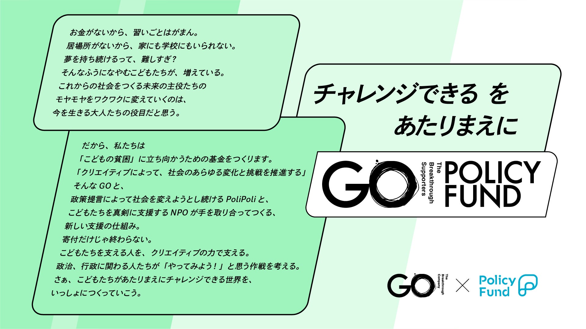 こどもたちが挑戦できる未来へ。GOが寄付×クリエイティブ支援で、こどもの貧困問題に取り組むNPOを支援する基金『GO POLICY FUND』を11月28日「寄付の日」に設立