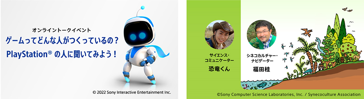 今年は、子どもたちが好奇心を育むきっかけとなるよう、2つのオンライントークイベントを開催します。CurioStep で開催中の環境教育プログラム「シネコポータル・ワークショップ」の特別編として実施する、「恐竜くんと考えよう!地球環境と生態系のふしぎ」では、恐竜時代の生態系のふしぎを紐解きながら、地球の成り立ちに迫ります。また、「ゲームってどんな人がつくっているの?PlayStation®の人に聞いてみよう!」では、ゲームのお仕事について、PlayStation にかかわる人が子どもたちの質問に答えます。どちらも参加上限なく、どなたでも自由にイベントにご参加いただけます。