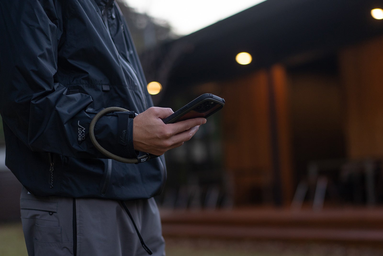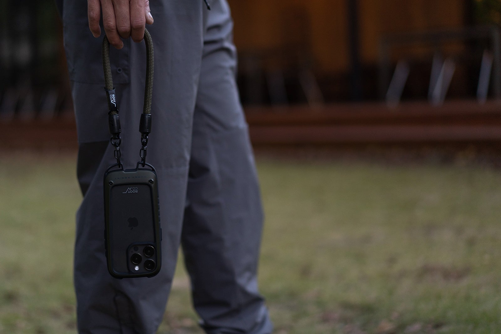 手首に通して落下防止や、パンツのウエストループに繋いでウォレットコードとしても、マルチに使えるショートストラップです。