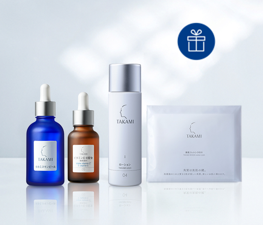 ブランド ロングセラー角質美容水「タカミスキンピール」の通常の2倍となる60mLのビッグボトルを中心に、スキンピールで整えた角質をさらに美しく導く人気No.1(※4)美容液「タカミエッセンスCE」など、肌悩みに合わせて選べる美容液や、スキンピールを使った後の肌のために作られた化粧水「タカミローション」の特別サイズ、さらに洗顔後の水分拭き取りシート「タカミ美肌コットンクロス」がセットに。