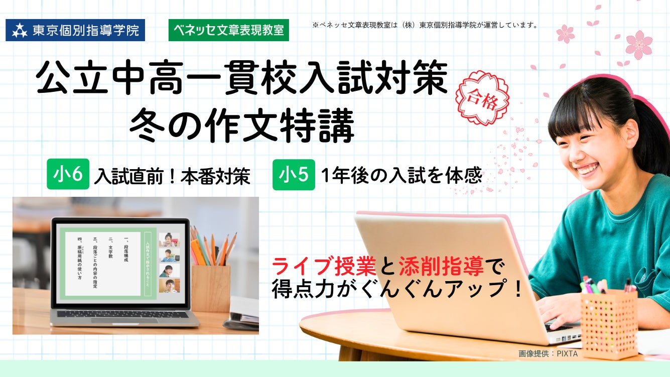 個別指導塾のパイオニアとして日本全国に272拠点(2025年4月1日時点)を展開するベネッセグループの株式会社東京個別指導学院(本社:東京都新宿区、代表取締役社長:松尾 茂樹)は、運営する「ベネッセ文章表現教室」の冬期講座として「公立中高一貫校入試対策・冬の作文特講」を開催します。対象は小学6年生と5年生で、ベネッセ文章表現教室にお通いでないお子さまもお申し込みいただけます。 オンラインのライブ授業と添削指導で過去問題にしっかり取り組み、「減点されない、得点に結びつく作文を書くテクニック」を身につけるプログラムです。