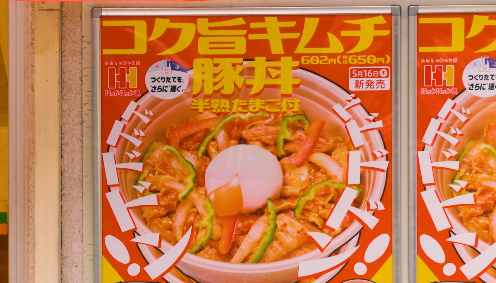 ランチを求めてあてもなく歩く腹へりギャル2人。同じような語感で、繰り返し淡々と会話を続けながら、ほっかほっか亭の前を通り過ぎます。一瞬、カメラがズームすると、そこには「コク旨キムチ豚丼」のポスターが。コク旨キムチ豚丼のシズルカットのシーンに続き、最後はギャル2人が、「ん?何か同じようなリズム?ウチら、何か忘れてる?」という、何ともいえない表情で終わります。ご覧いただいた皆さまからは「で、食べへんのかい!」というツッコミが聞こえてきそうな摩訶不思議な雰囲気を醸し出す仕上がりとなりました。