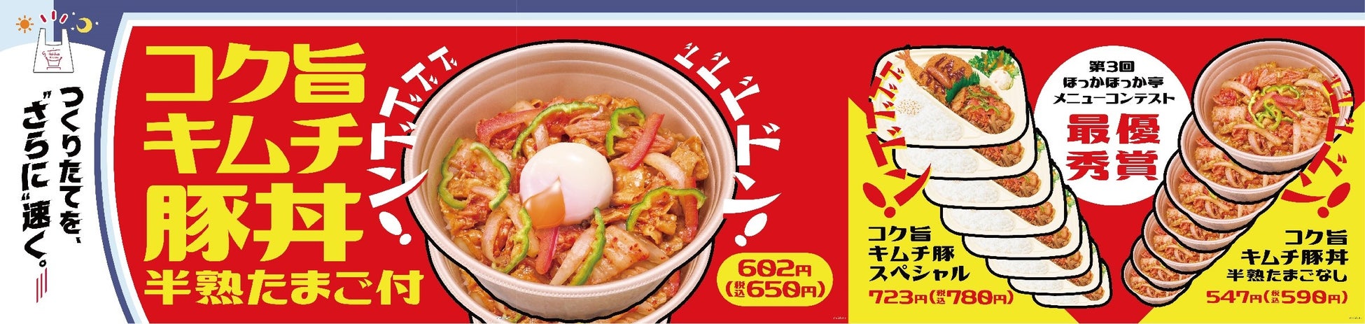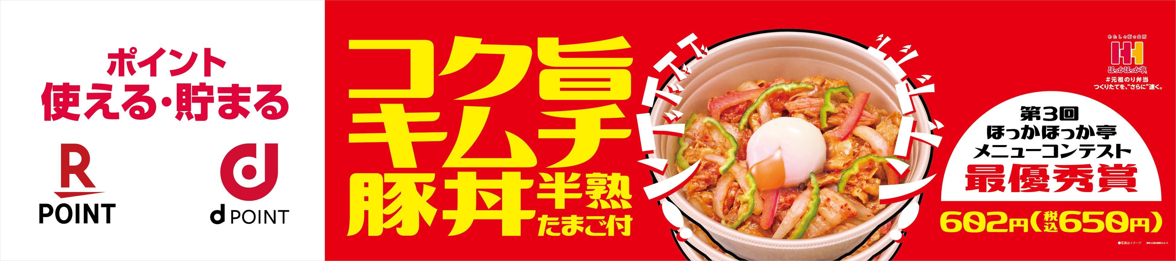*1:コク旨キムチ豚丼は、北海道、秋田県、宮城県、山梨県、関東地方、東海・北陸地方、大阪府、兵庫県(淡路島を除く)、京都府、滋賀県、奈良県、和歌山県、中国地方、九州地方の各ほっかほっか亭で販売します。