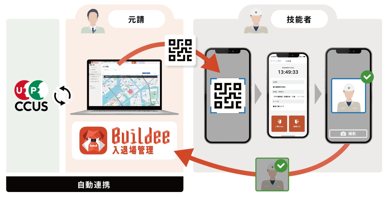 当機能は、顔写真の登録と、技能者の入退場数に応じた従量課金制であり、建設現場の入退場管理サービス「Buildee入退場管理」をご利用の現場でのみ利用可能です。元請会社が発行したQRコード※1を技能者が自身のスマートフォンで読み込むことで顔認証を実施でき、入退場記録は「Buidee入退場管理」および、建設キャリアアップシステム(以下:CCUS)に自動連携されます。