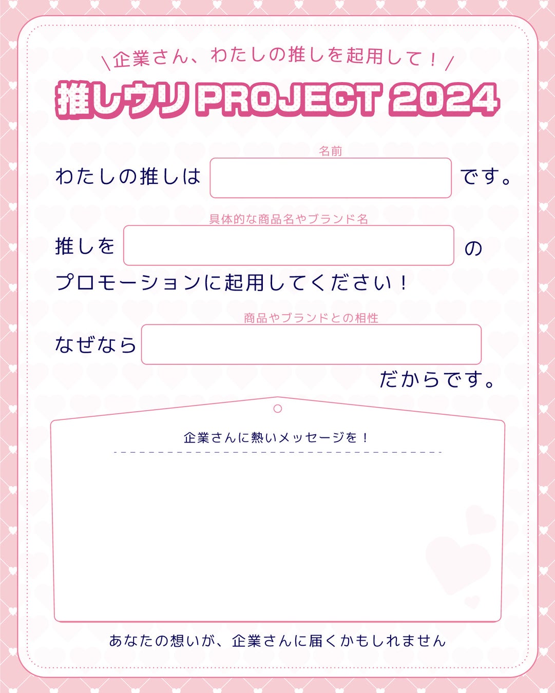 このプロジェクトは、推し活の記念日である11月04日「いい推しの日」に合わせて、推し活をしている人に対して「自分の推しをどのような企業のプロモーションに起用してほしいか」について、 X(旧Twitter)にて投稿を促す企画です。「推しウリ」は、企業に向けて推しを売り出すことをコンセプトとした名称となっています。