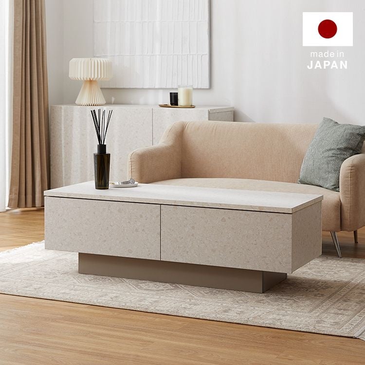 程よいニュアンスカラーが魅力的な、柔らかく温かみのあるオリジナルデザインのテラゾー柄センターテーブル。フルスライドの引き出し付きで収納性にも優れています。
