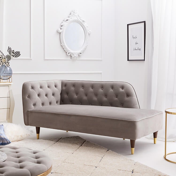 アンティーク家具からインスピレーションを受けたエレガントなベルベット調カウチソファ。美しいシルエットともっちりとした弾力のある座り心地にこだわりました。