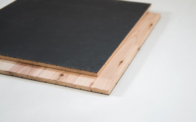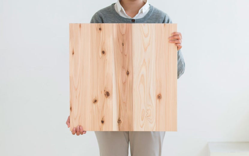 森の手入れをする為に間伐されたヒノキやスギを原材料にしており、細い木材や曲がりのある木材、節のある木材でも新たな価値を見出そうと、1枚50cm×50cmのサイズで作られています。
