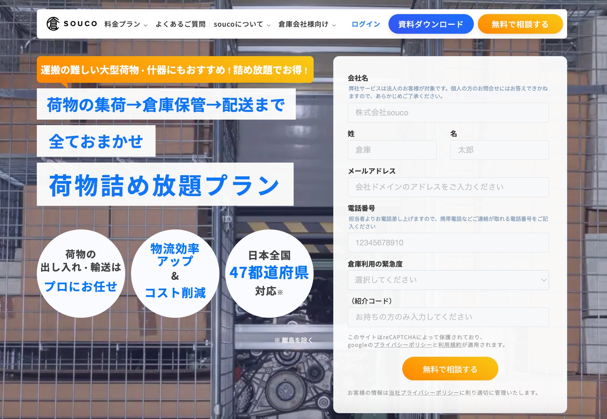 なお、【カゴ台車・荷物詰め放題プラン】はsouco社が提携する輸送業者がカゴ台車の手配・荷物の集荷配送を行い、全国のsouco社の登録倉庫にて荷物保管を行います。[1]