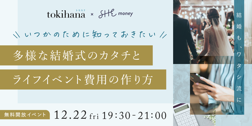 【tokihana×SHEmoney】がコラボレーション!結婚も、ワタシ流に。 「多様な結婚式のカタチとライフイベント費用の作り方」について学べるオンラインイベントを開催!