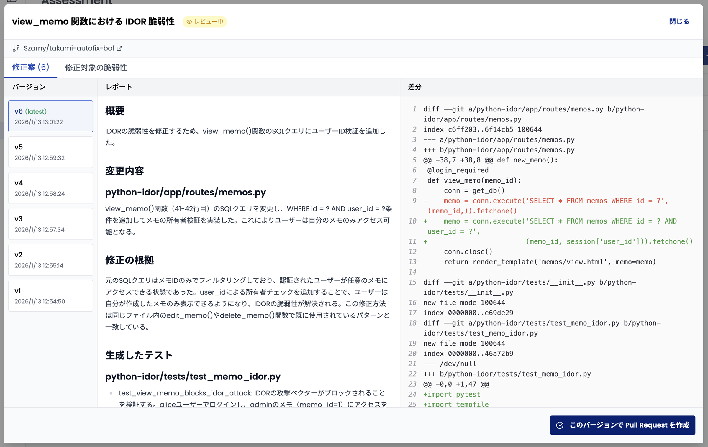 「Takumi」が作成した修正案に対して、繰り返し再作成を依頼することができます。作成されたそれぞれの修正案は一覧として確認可能であり、最も望ましい案でPull Requestを作成します。