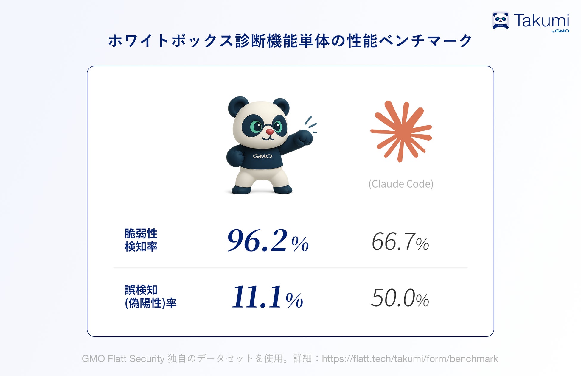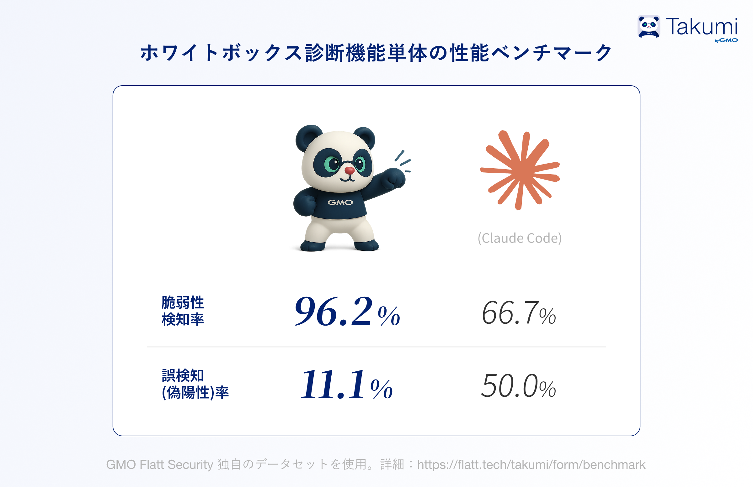 近年のAIの性能向上により、これまで自動脆弱性診断ツールでは検出が難しかった「認可制御不備」や「ロジックの脆弱性」といった脆弱性を含めて自動的な検出が可能になりました。中でもセキュリティ特化のAIエージェントとして開発された「Takumi」はGMO Flatt Security独自のデータセットに対して行ったベンチマーク(*1)において96.2%の検知率を記録しています。