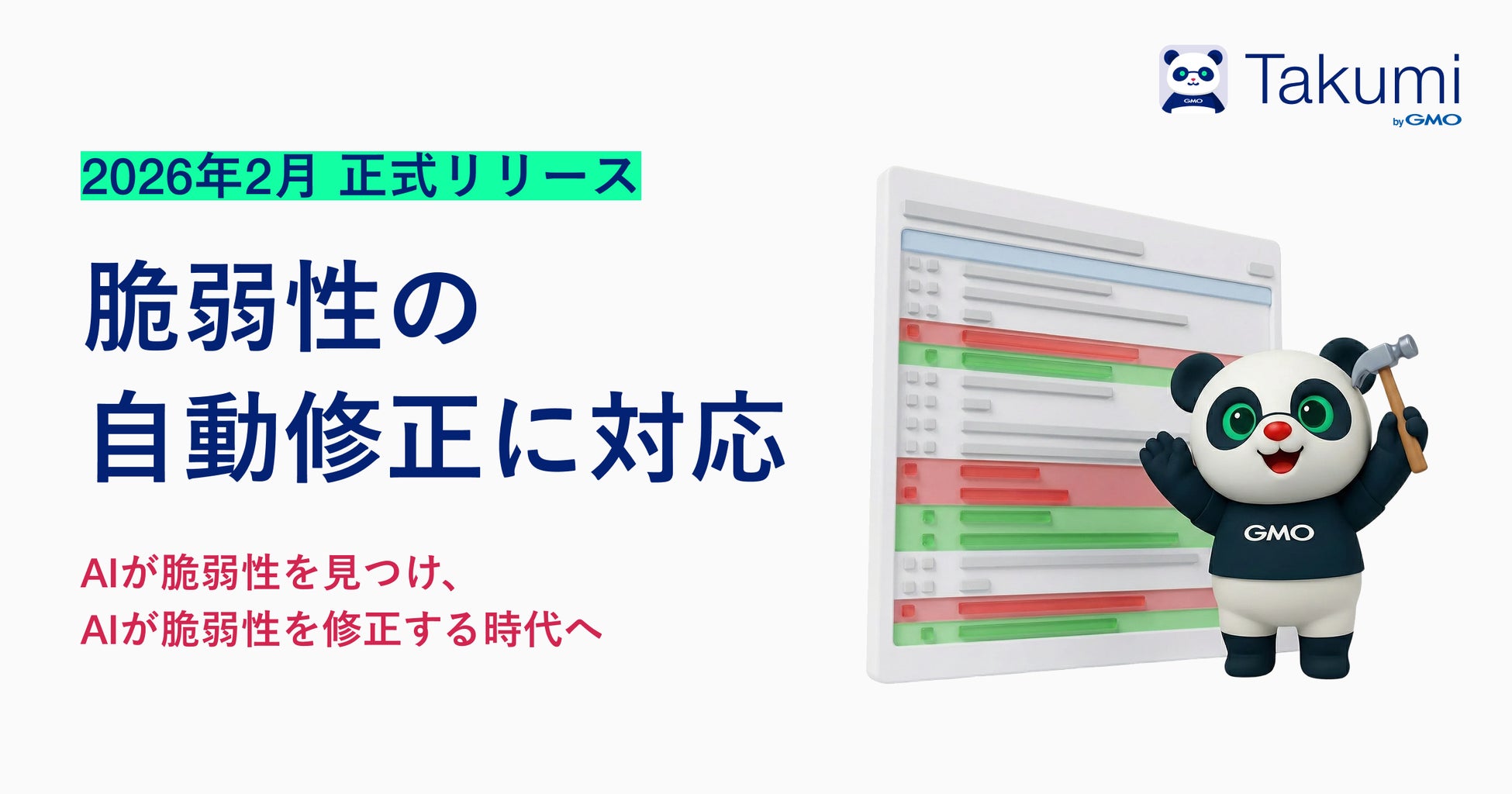 GMOインターネットグループで「エンジニアの背中を預かる」をミッションに、プロダクト開発組織に向けたサイバーセキュリティ関連事業を展開するGMO Flatt Security株式会社(代表取締役社長:井手 康貴 以下、GMO Flatt Security)は、2026年2月5日(木)より、セキュリティ診断AIエージェント「Takumi byGMO(以下、Takumi)」の「自動修正機能」を正式に提供開始しました。これにより、脆弱性の検出から修正までを一貫してAIが担うことで、開発者の負担を軽減し、より安全なソフトウェア開発サイクルの実現が可能になります。