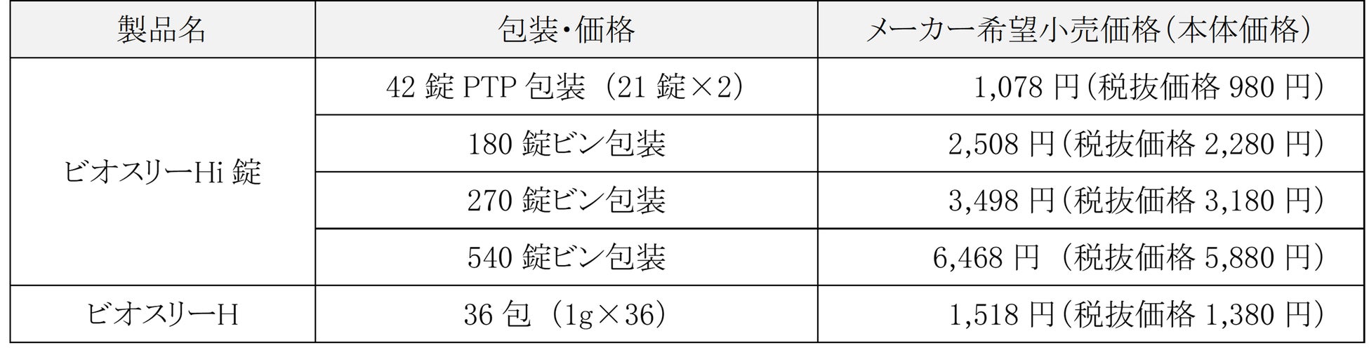・ビオスリーHi錠:バレイショデンプン、セルロース、ヒドロキシプロピルセルロース、乳糖水和物、無水ケイ酸、タルク、ステアリン酸Mg