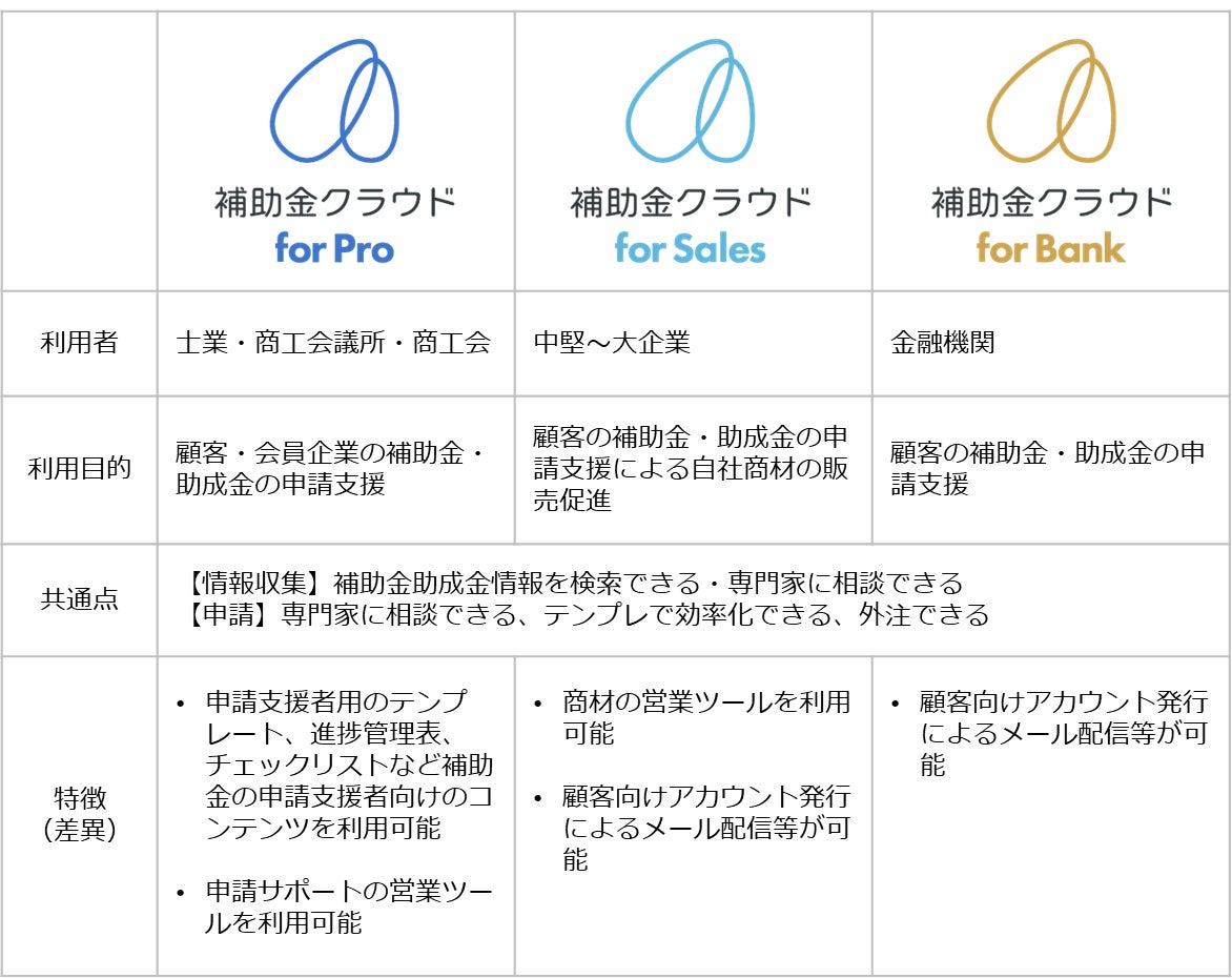会員企業や顧客の応援手段として、補助金・助成金申請支援サービスを追加・拡大したい方は、『補助金クラウド for Pro』を利用するとよいと思います。」