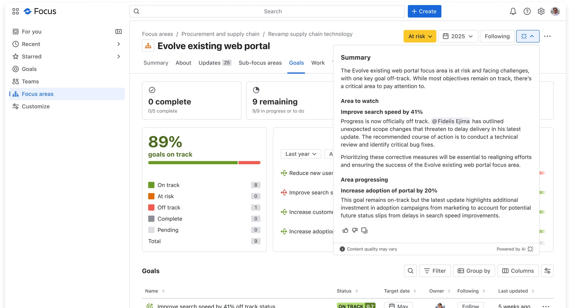 リーダーは、注意すべき何かが変更されるとすぐに通知を受け取ります。リーダーは、進行中の内容やゴールの進捗状況、注意すべき点の提案、積極的な対応の推奨事項など、重点分野の概要を1クリックで入手できます。