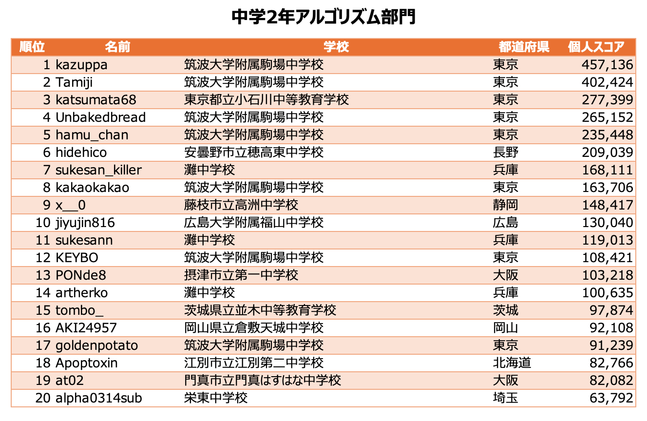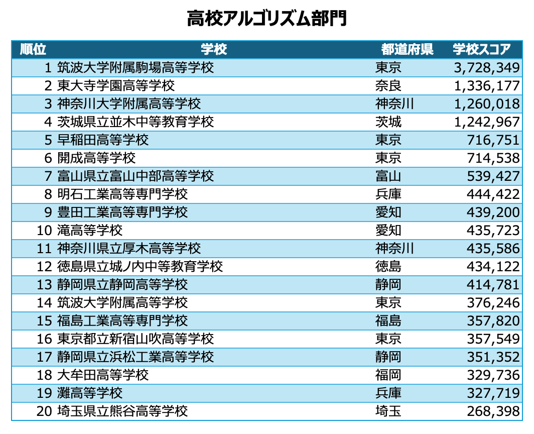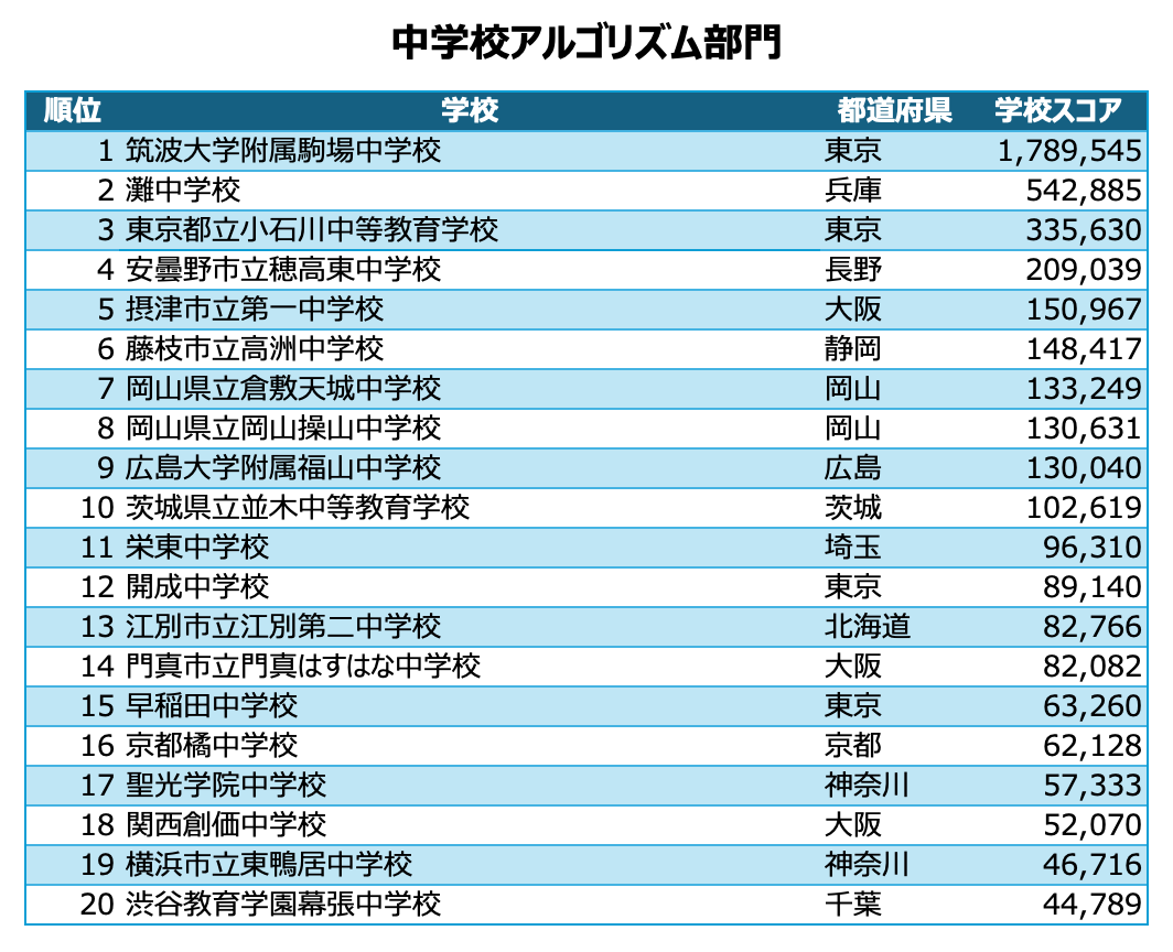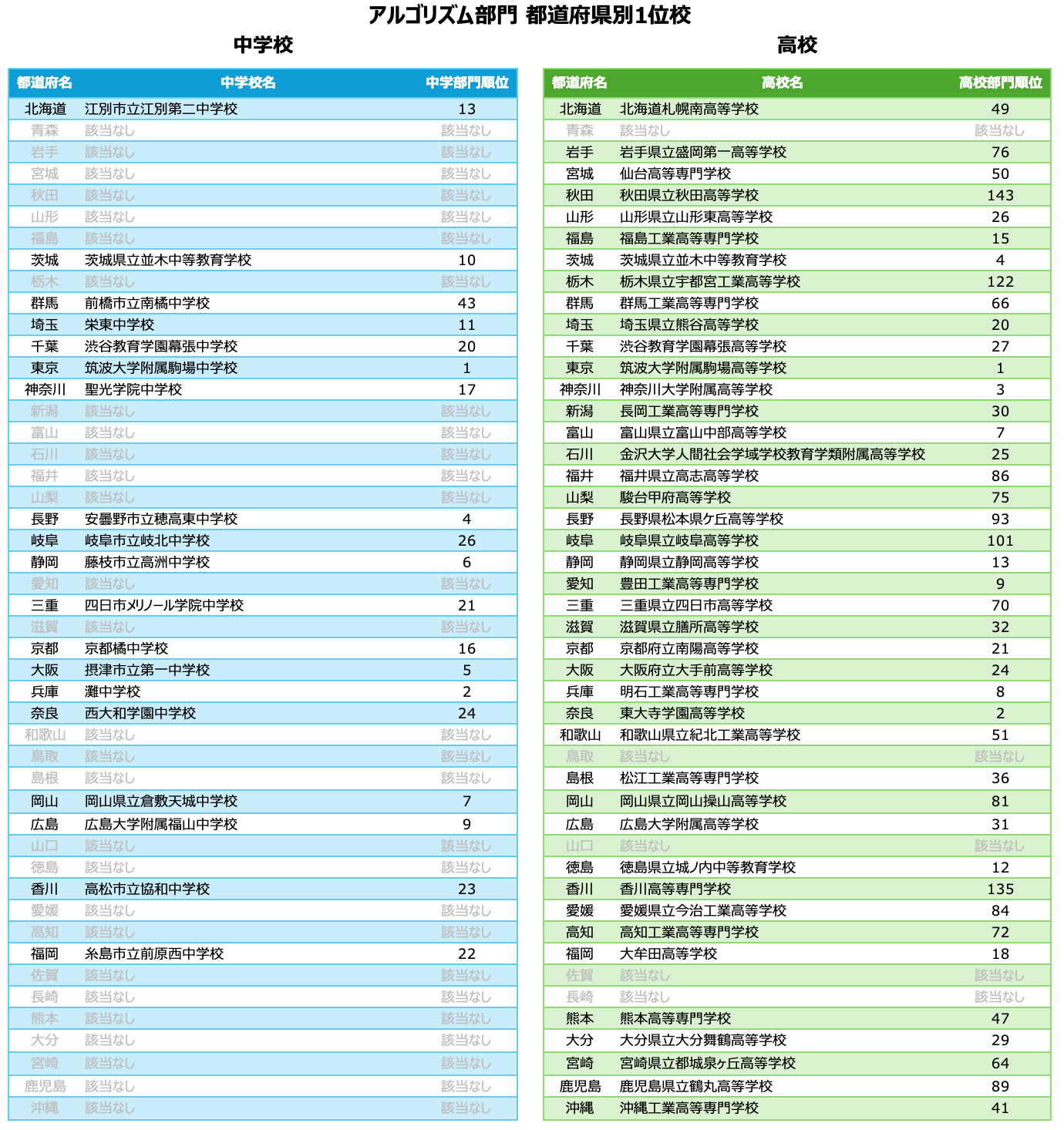 <アルゴリズム部門 都道府県別1位の中学校・高校>